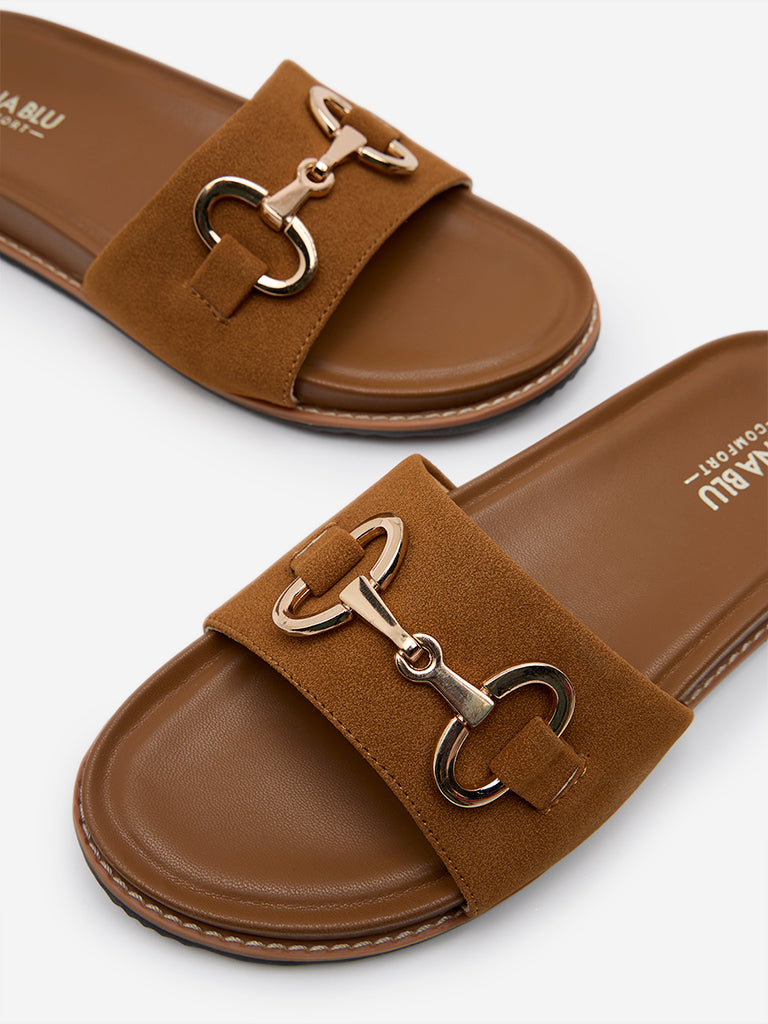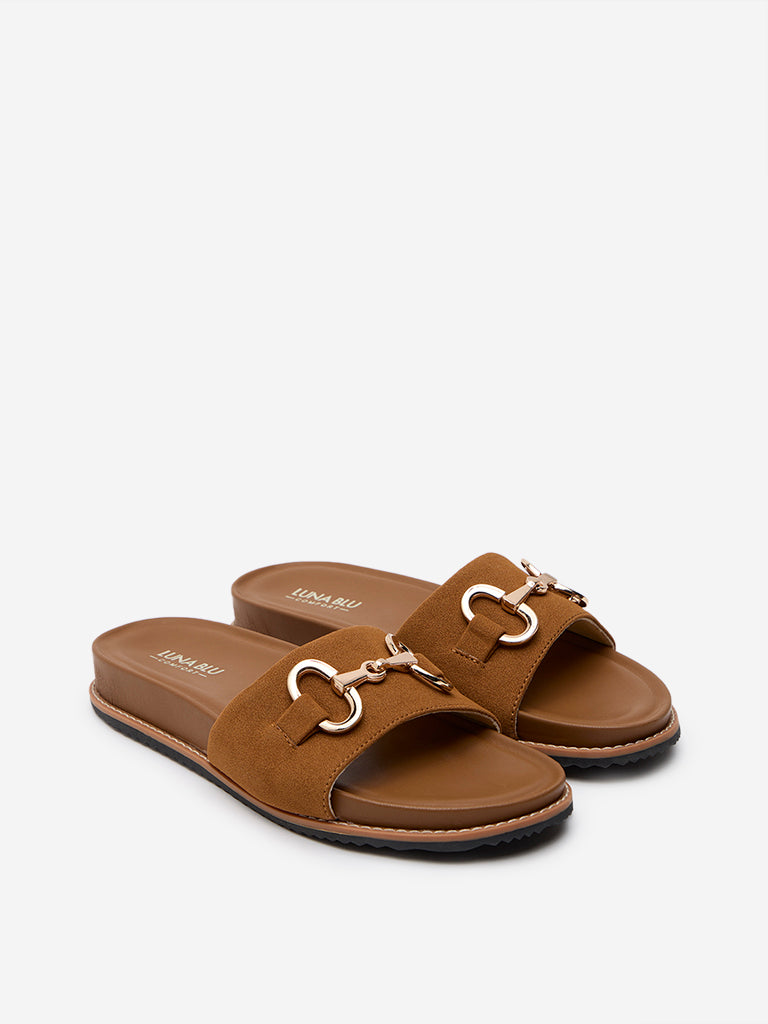 These tan slides by Luna Blu flaunt a single-band design. decked with a golden metal saddle trim. Crafted with durable material. the slip-on footwear comforts through its cushioned footbed and midsole and water-resistant outsole.