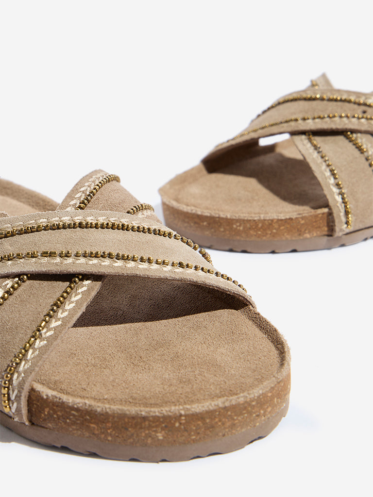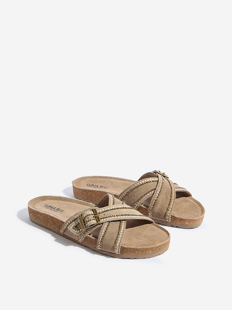 Luna Blu introduces taupe criss-cross sandals featuring soft suede straps with delicate metallic embellishments. Designed with a cork-textured insole. they offer a cushioned feel. The ridged outsole provides reliable traction for everyday wear. making them a stylish and comfortable choice for summer.