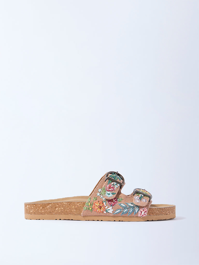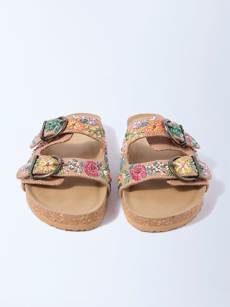 Bring effortless summer style to your look with these taupe slip-on sandals from Luna Blu. Featuring dual straps embroidered with floral patterns on a raffia base. they strike the perfect balance of comfort and charm. A padded footbed offers ease through the day. while the chunky sole with a textured outsole ensures reliable grip for every step.