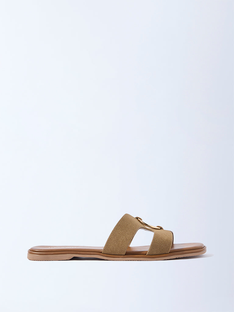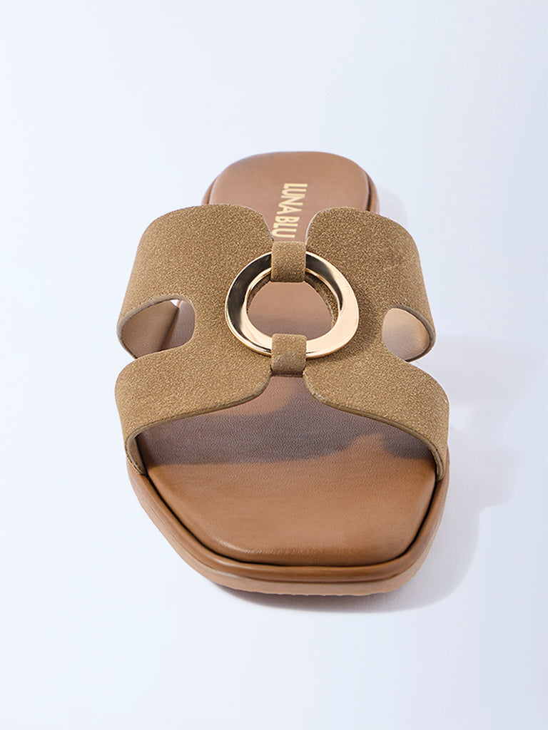 Modern and minimal. these taupe slides from Luna Blu bring effortless ease to everyday dressing. Featuring broad cut-out straps accented with a sleek gold-toned ring. they offer a refined yet relaxed aesthetic. The cushioned sole ensures comfort through the day. making them perfect for pairing with linen separates or flowy dresses.