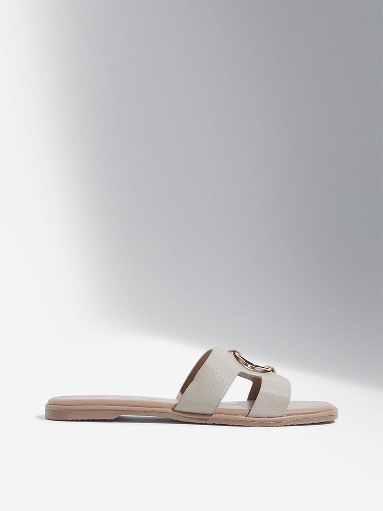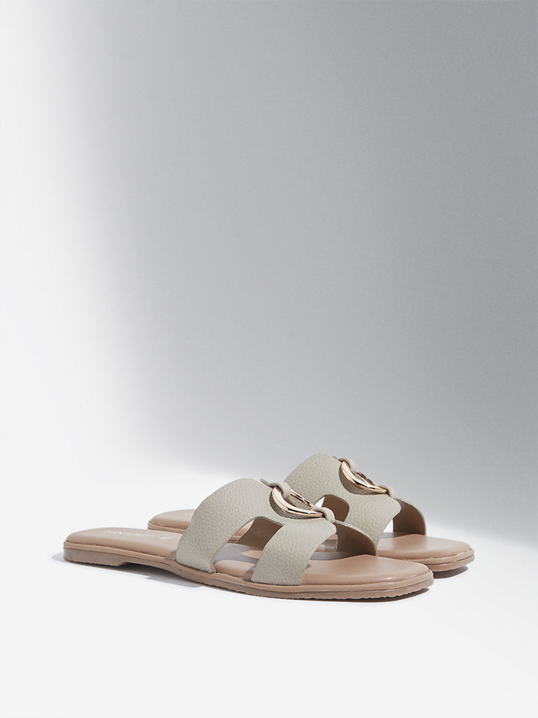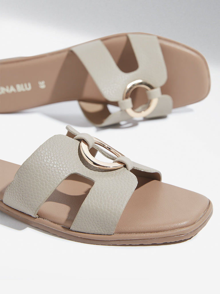 These taupe slides from Luna Blu feature metal detailing on the upper. They are equipped with a smooth footbed and textured outsoles. ensuring a comfortable walking experience.