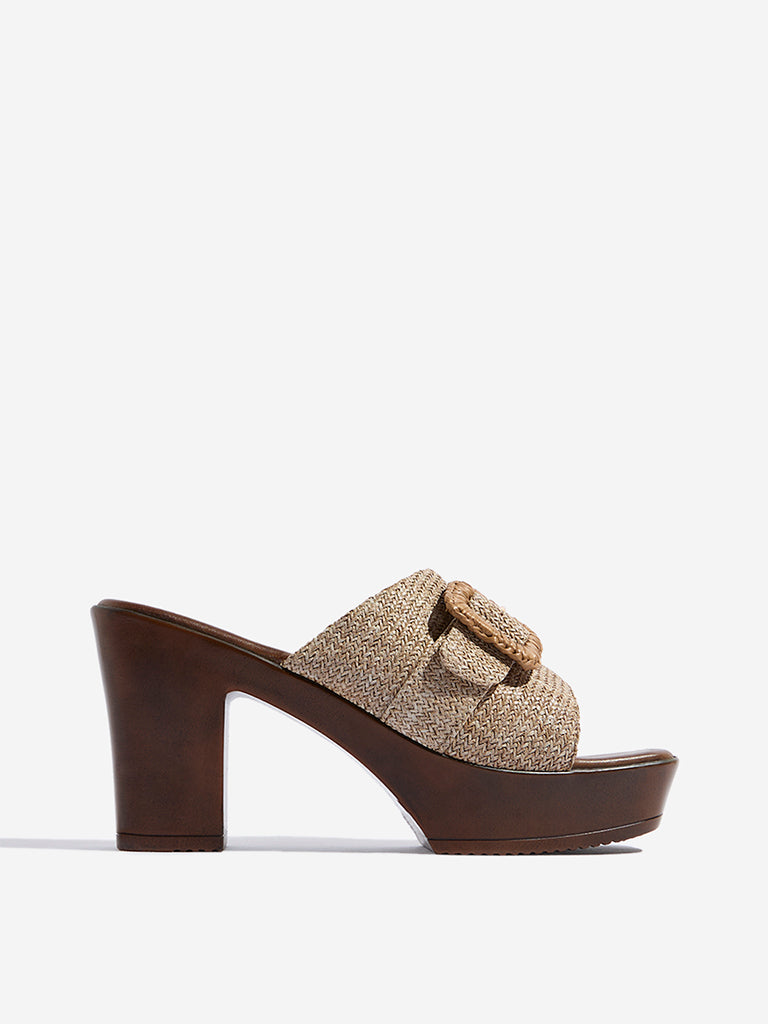 These taupe sandals from Luna Blu are fashioned with a raffia-textured upper. highlighted by a statement buckle for a chic touch. Set on a sturdy block heel for a subtle lift. they are finished with a cushioned footbed to ensure all-day comfort.