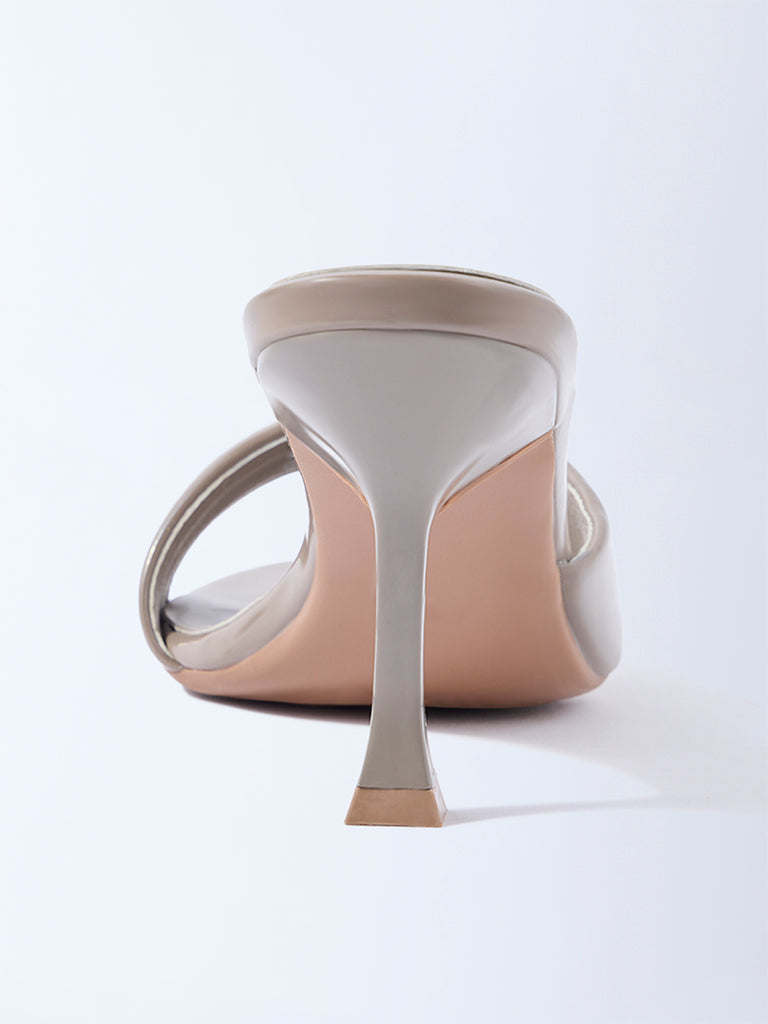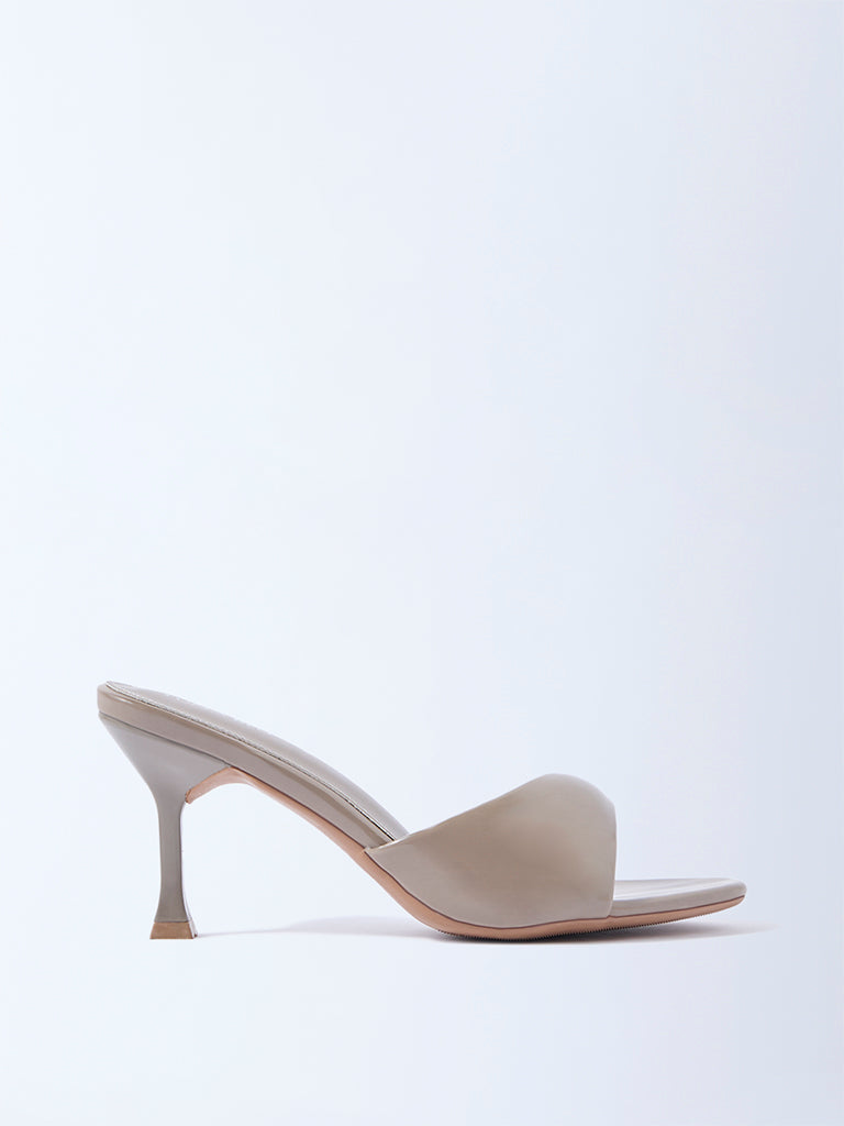 Perfect for evenings that call for understated glamour. these heel sandals from Luna Blu bring effortless polish to every party look. Crafted in a glossy taupe finish. the slip-on design features a sleek wide strap and a sculpted heel that elongates the silhouette. The smooth footbed ensures lasting comfort. making them as easy to wear as they are refined.