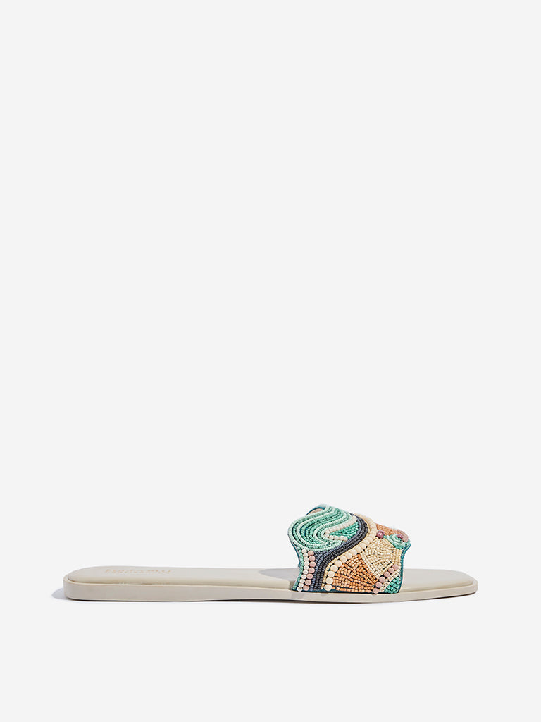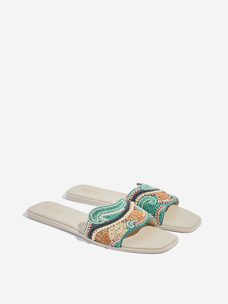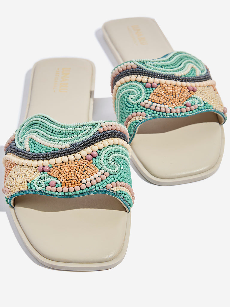 Channel effortless elegance with these captivating turquoise slides from Luna Blu. The wide strap doubles as a canvas. adorned with intricate multi-coloured beadwork and embroidery that echo vibrant landscapes and abstract artistry.