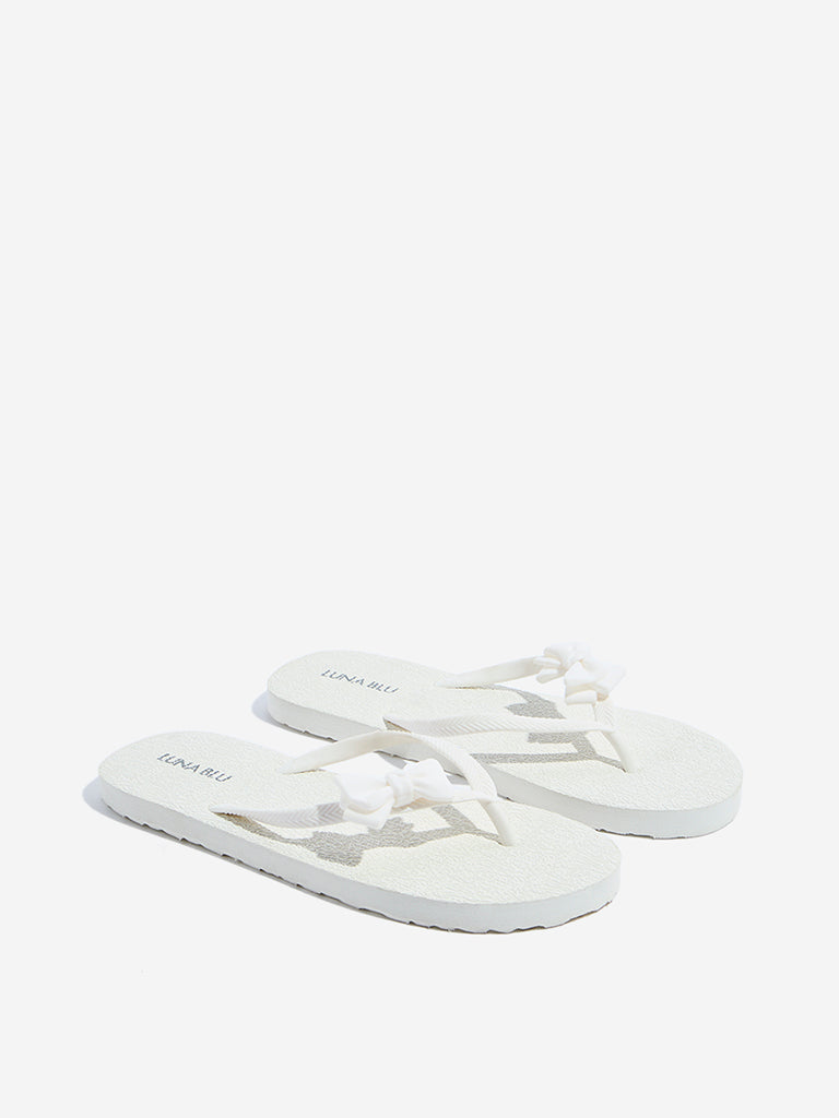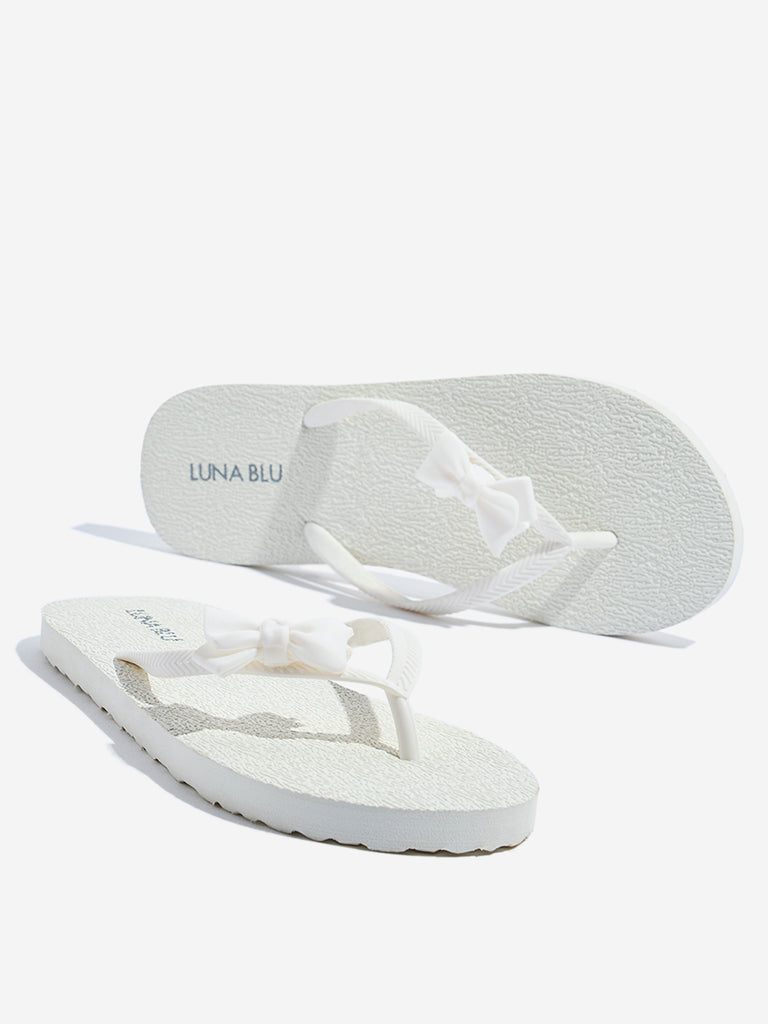 These white flip-flops from Luna Blu bring a playful touch to laid-back styling. Designed with classic thong straps topped with a charming bow. they’re crafted with a subtly textured footbed for added comfort and grip. Finished with a ridged outsole for easy movement. they’re the perfect pick for beach days. weekend errands. or casual strolls under the sun.