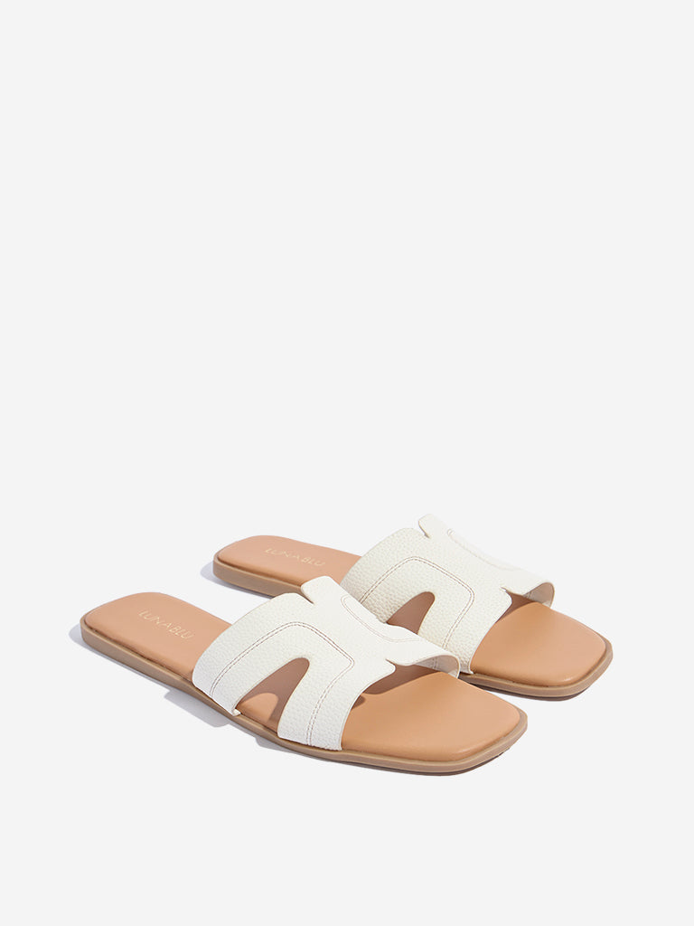 Fortify your footwear line-up by selecting these white slides from Luna Blu. The lightweight profile is enhanced by a padded insole. ensuring both style and comfort with every step. But its the subtle embroidery details on the straps that add to its style.