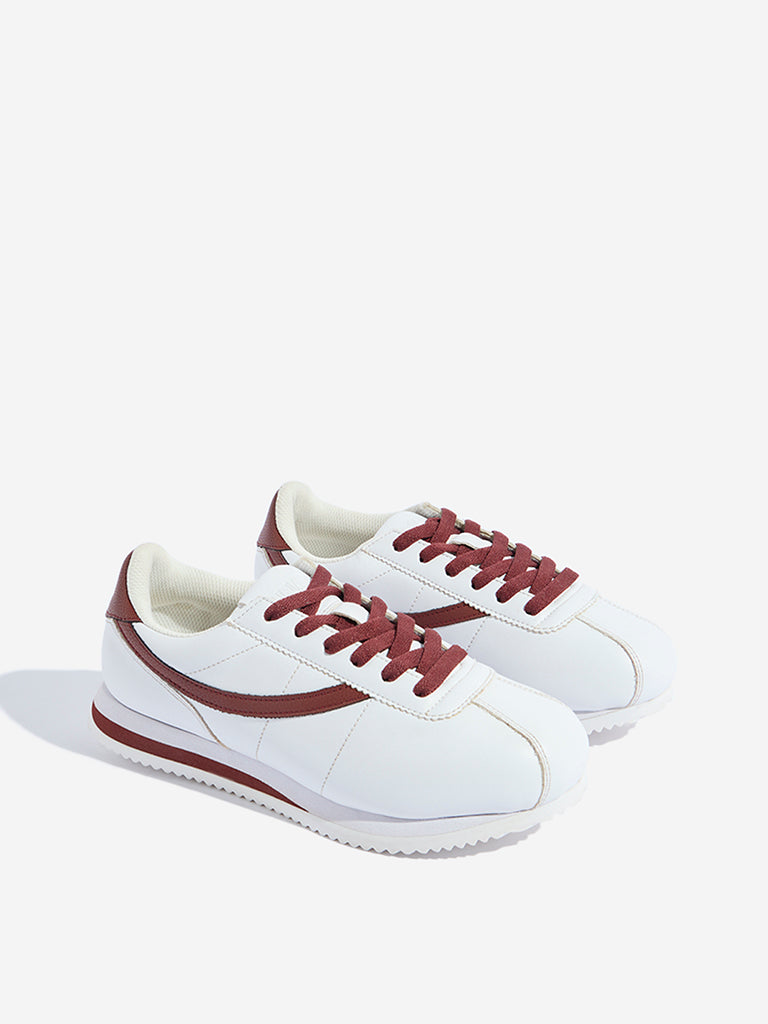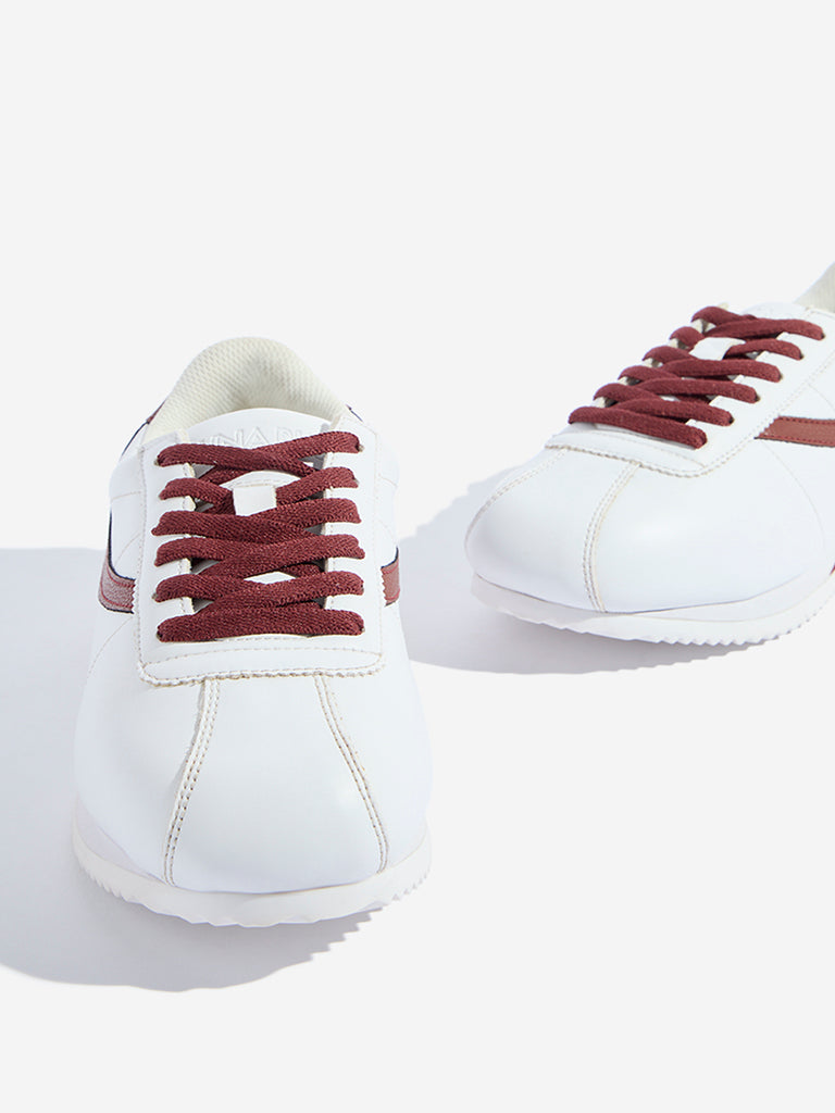 These white sneakers from Luna Blu combine timeless appeal with a touch of sporty elegance. The sleek upper is enhanced by bold burgundy accents on the side stripes. heel tab. and laces. Designed with a cushioned insole for all-day comfort and a textured outsole for superior traction. these sneakers offer both style and practicality for everyday wear.