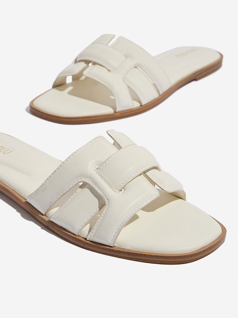 Luna Blu introduces these white slides. featuring multiple straps for a secure and stylish fit. Designed for all-day comfort. they come with a cushioned footbed and a textured outsole. ensuring a steady grip with every step.