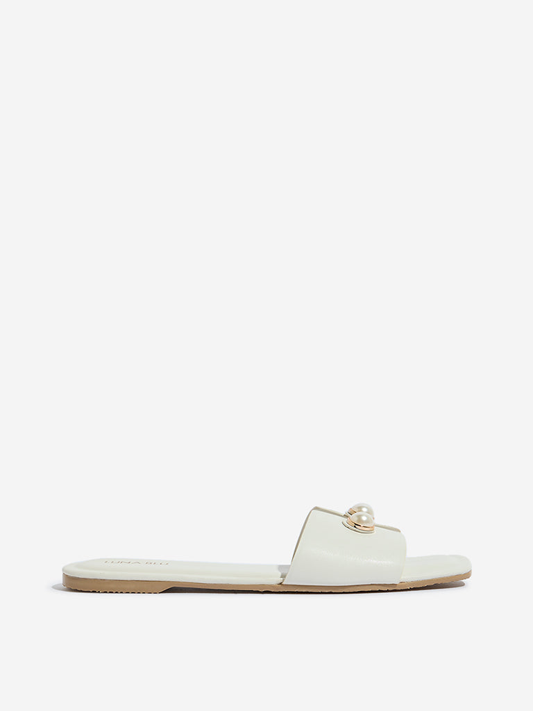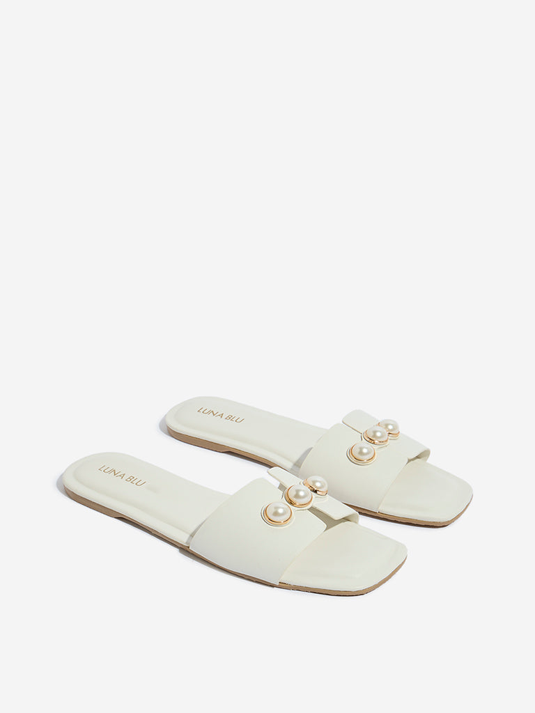 Add a touch of sophistication to your ensemble with these white slides from Luna Blu by Westside. Adorned with pearl embellishments on the upper. they exude elegance while offering comfort with a soft insole and a grip-rich outsole for effortless movement.
