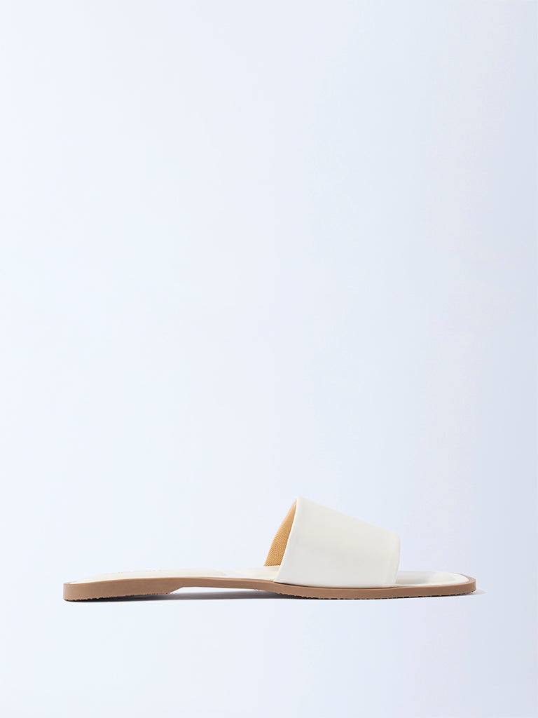 Keep your summer edits sleek with these white slides from Luna Blu. Designed with a wide. smooth strap and a modern square toe. they feature a crisp ivory finish contrasted against a tan outsole. Minimal yet contemporary. this versatile pair complements everything from casual denim to breezy dresses.