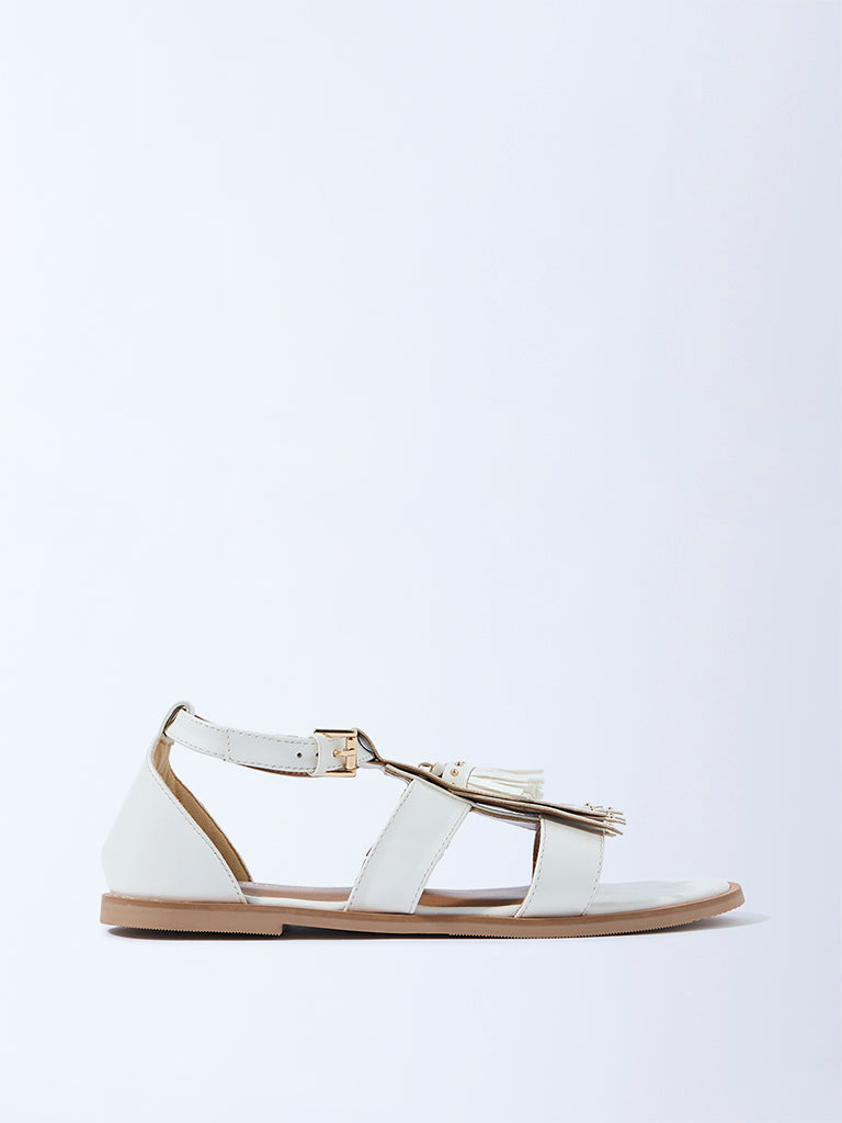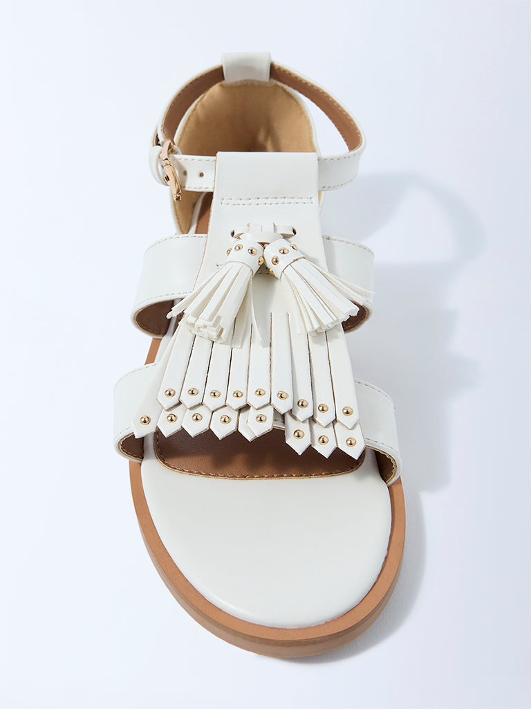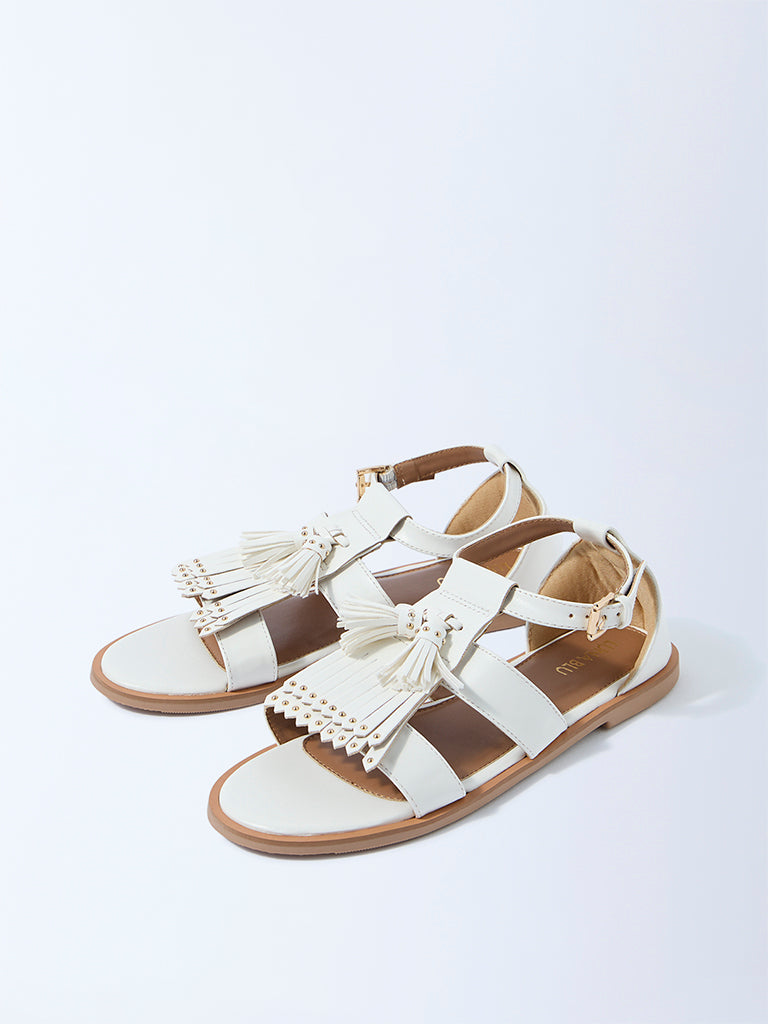 Add a playful twist to your footwear edit with these white sandals from Luna Blu. styled with fringe accents and tassel details on the upper. Designed with a buckle-fastened ankle strap. the pair offers a secure fit while keeping the look light and contemporary. Completed with a soft insole for comfort and a textured outsole for grip. these sandals balance character with ease of wear