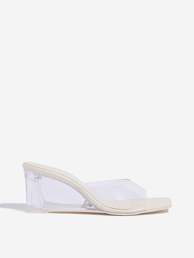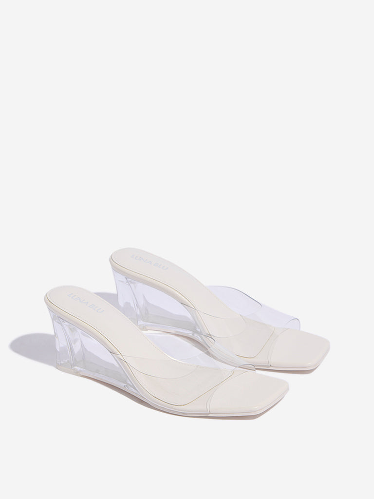 These white wedge sandals from Luna Blu are designed with transparent vinyl straps and a clear. wedge heel. The clean contours add a refined statement to any dressy outfit while the soft footbed provides all-day comfort. offering a fresh spin on elevated summer style.