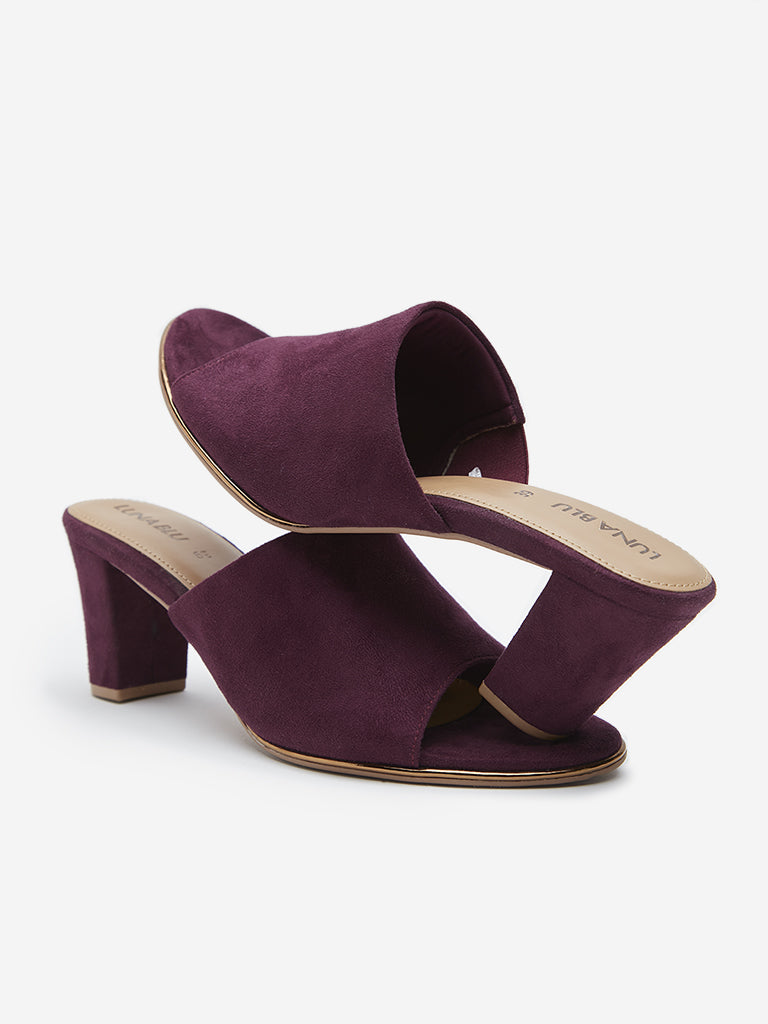 Luna Blu presents these chic block heel sandals in wine hue. The footwear features a broad upper strap with a smooth suede finish. The elasticated detailing on the vamp ensures a top-notch fit. Its cushioned insole. and textured build of the outsole offer a stylish walking experience with ample comfort.