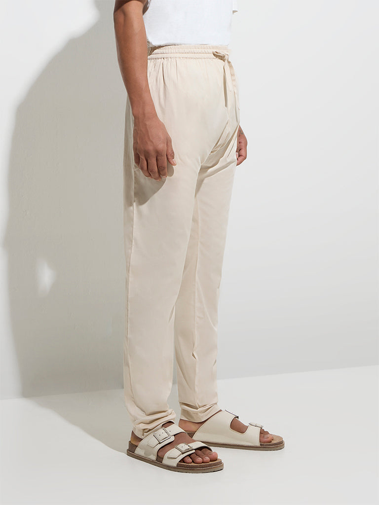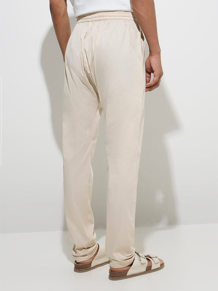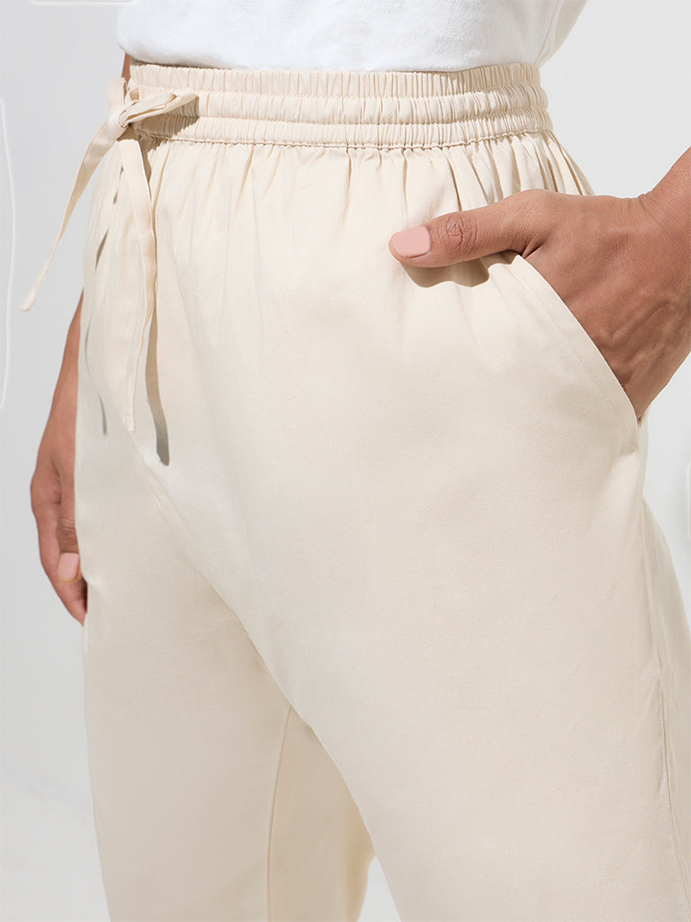 These beige pants from Mens Ethnicwear by Westside are a timeless essential crafted from pure cotton for a breathable feel. Designed with a mid-rise fit. the relaxed-fit bottom wear features a smooth waistband with adjustable drawstrings and side pockets for added convenience.