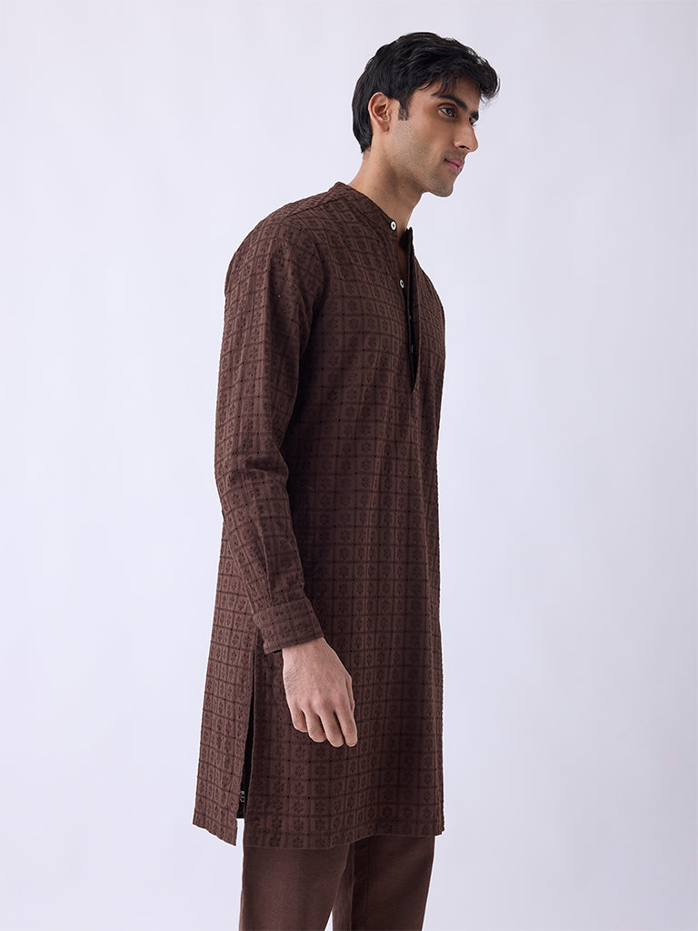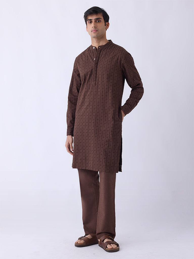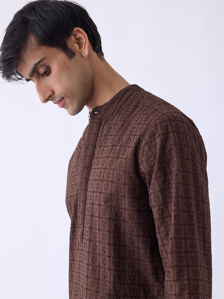 Enrich your festive repertoire with this brown kurta from Kala by ETA. Milled from pure cotton for a breathable feel. it features intricate floral embroidery that elevates its relaxed silhouette with artisanal detail. Styled with a mandarin collar. a short button-up placket. and full sleeves. it strikes the perfect balance between tradition and modernity.