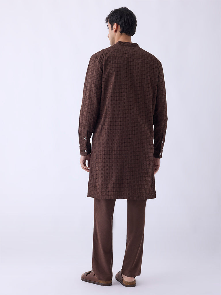 Mens Ethnicwear Brown Embroidered Relaxed-Fit Cotton Kurta