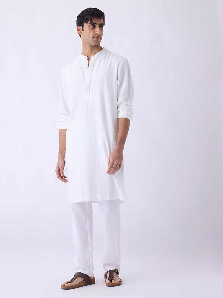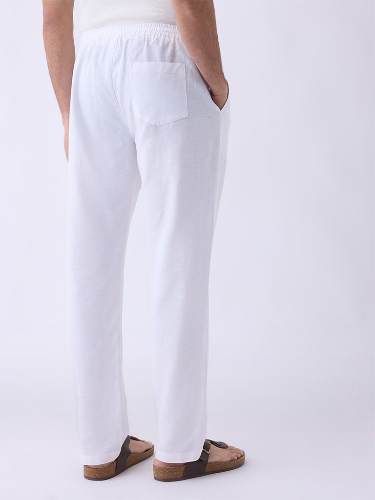 This pair of white pants from Kala by ETA balances traditional elegance with contemporary menswear sensibility. Spun from a lightweight fabric. they offer breathable comfort while maintaining a relaxed silhouette. The elasticised waistband with adjustable drawstrings ensures a tailored fit. while multiple pockets lend functional utility.