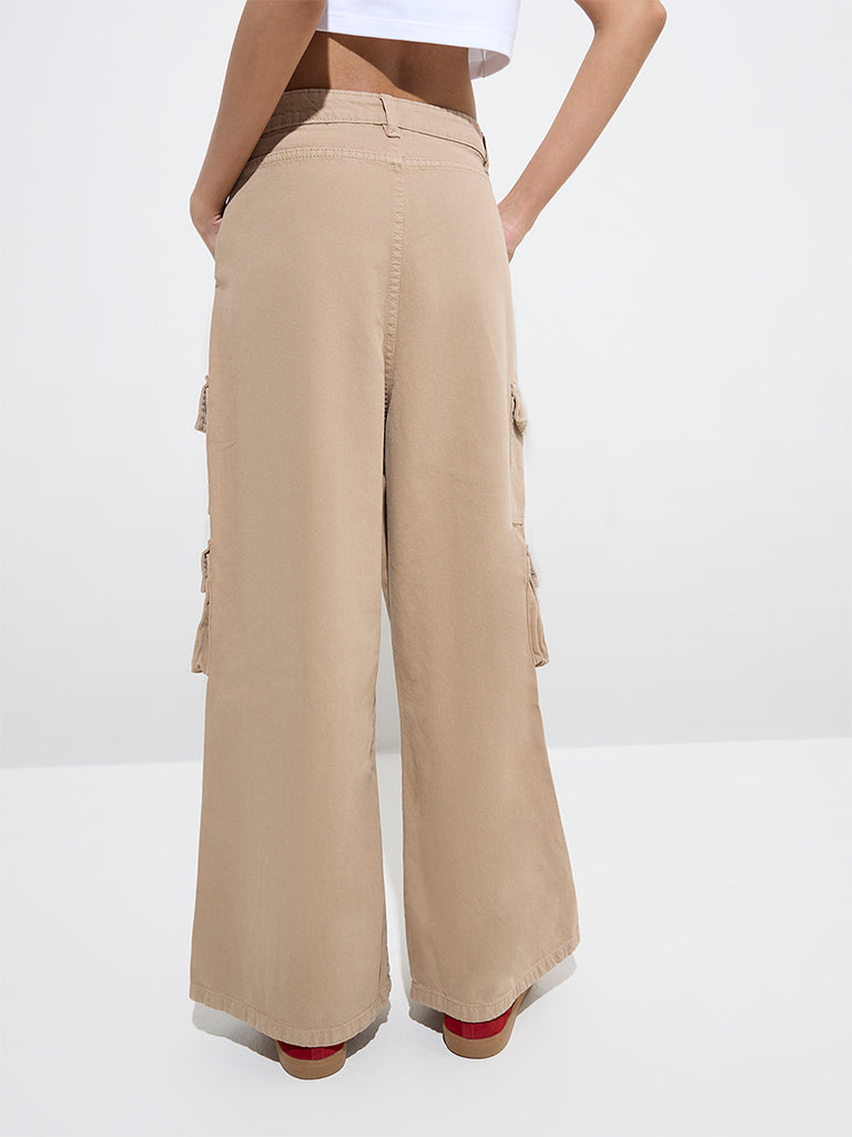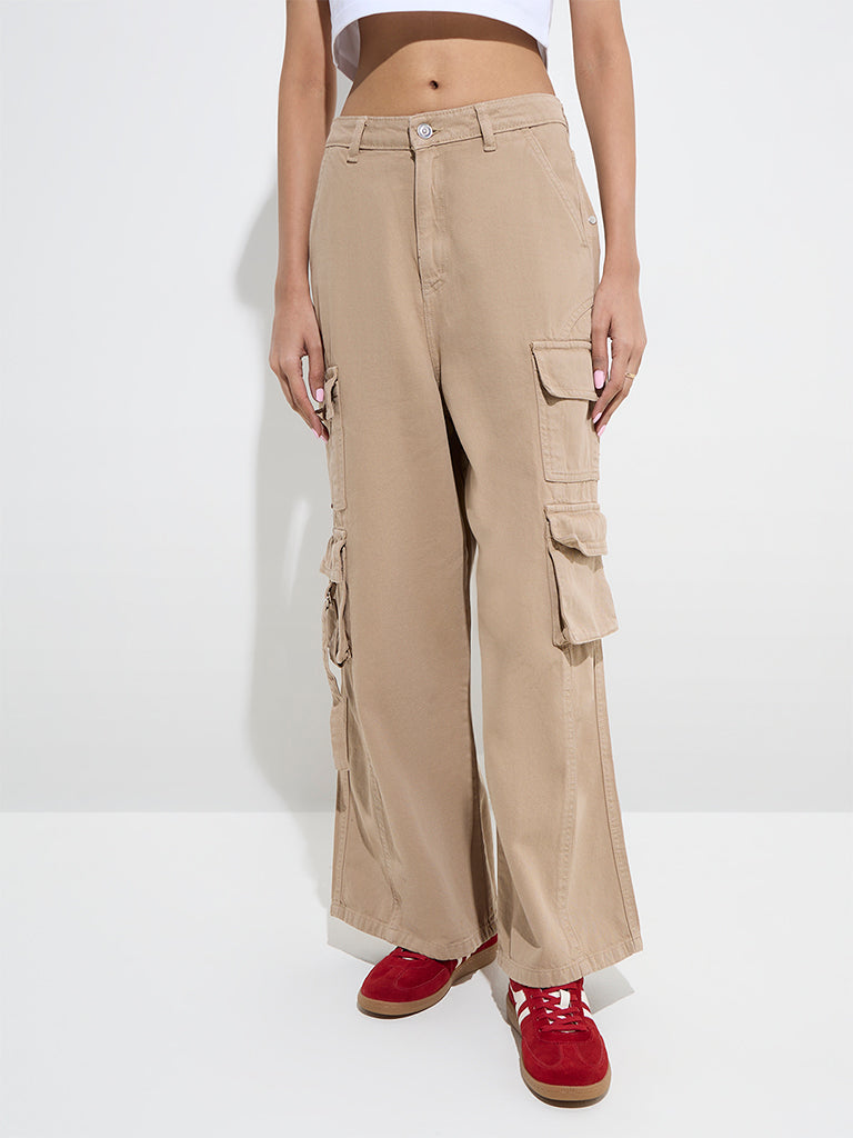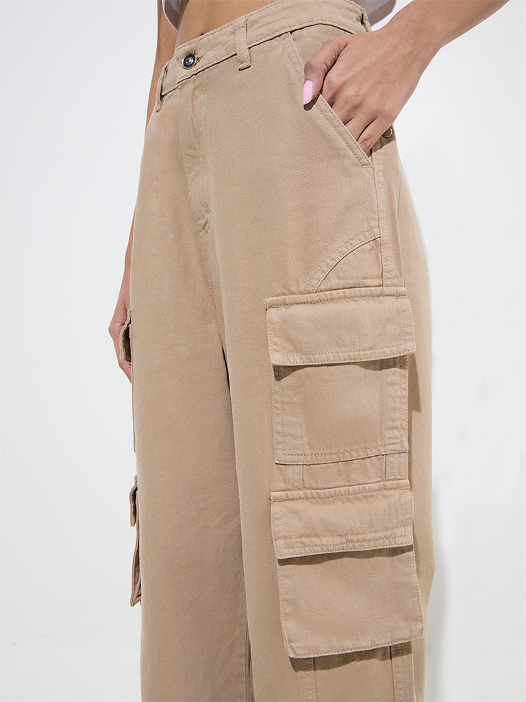 Nuon Beige Cargo-Style Straight-Fit High-Rise Jeans