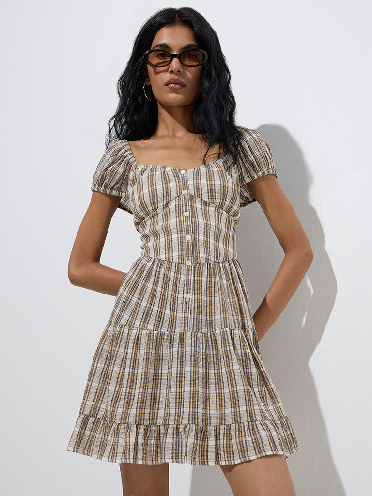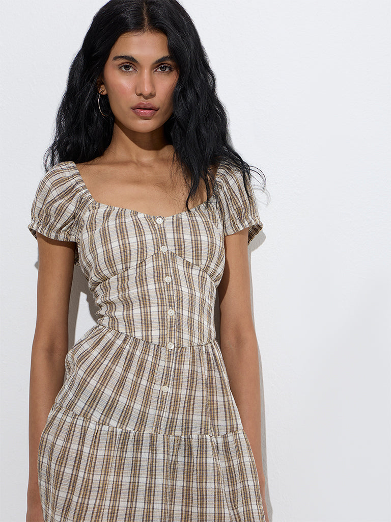 Nuon Beige Checks Design Cotton Tiered Dress