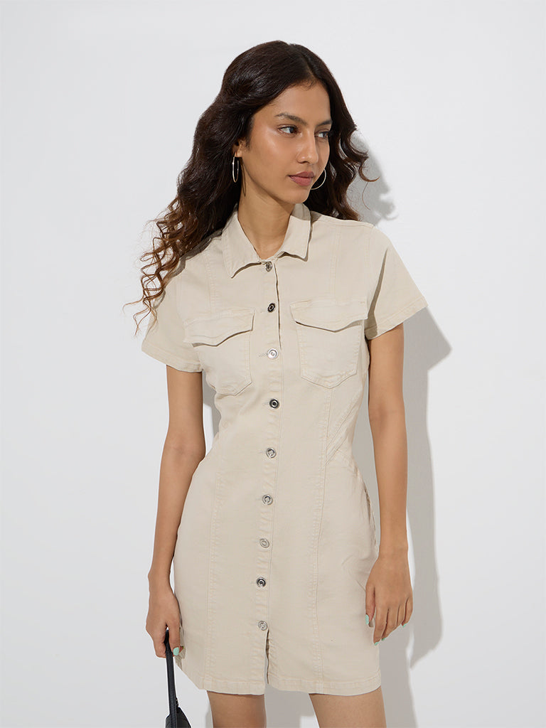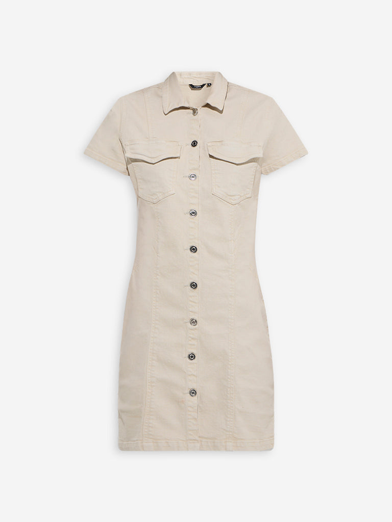This beige denim shirt dress from Nuon is the perfect blend of laid-back style and everyday function. Milled from a sumptuous cotton-blend fabric. it features a classic collar. button placket. and short sleeves for a timeless appeal. Finished with functional patch pockets. this dress channels a utility-inspired vibe while keeping things effortlessly comfortable.