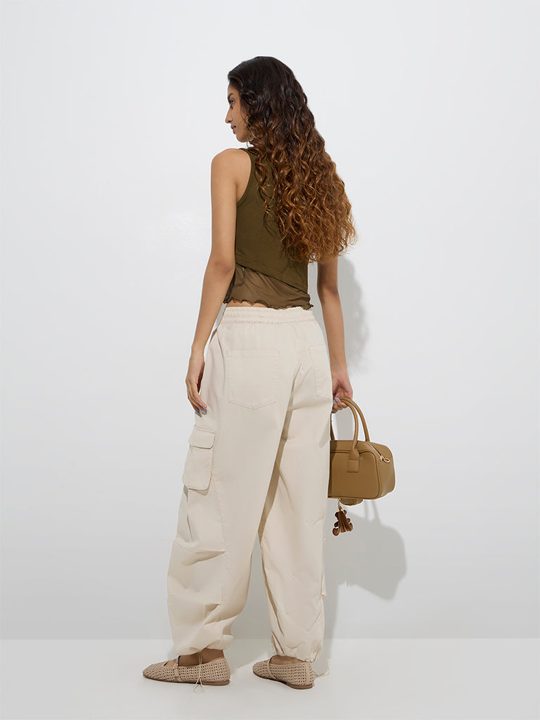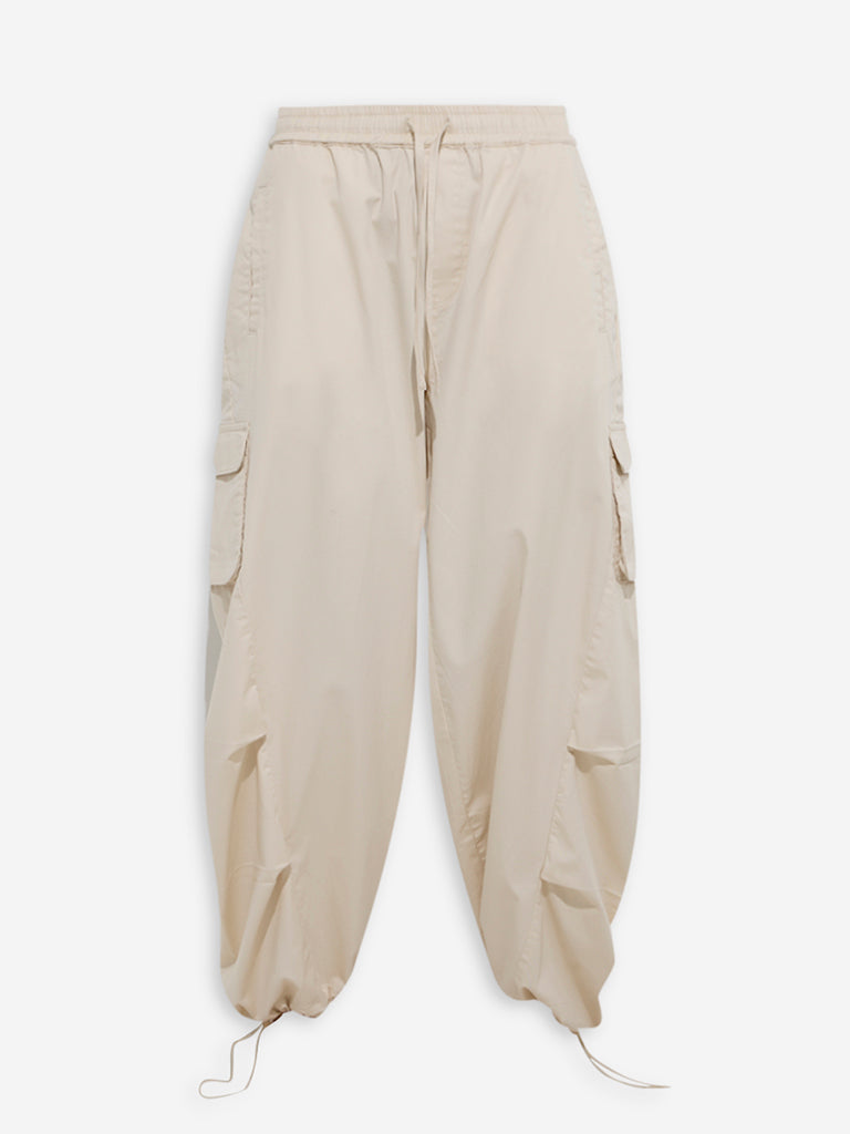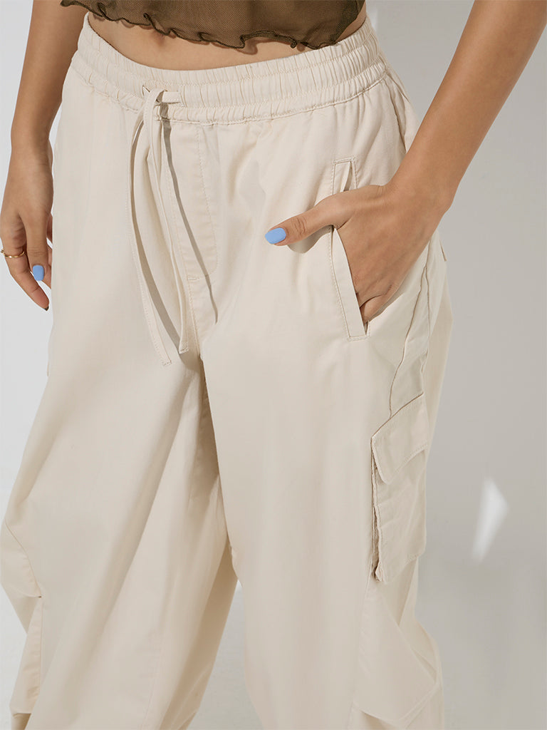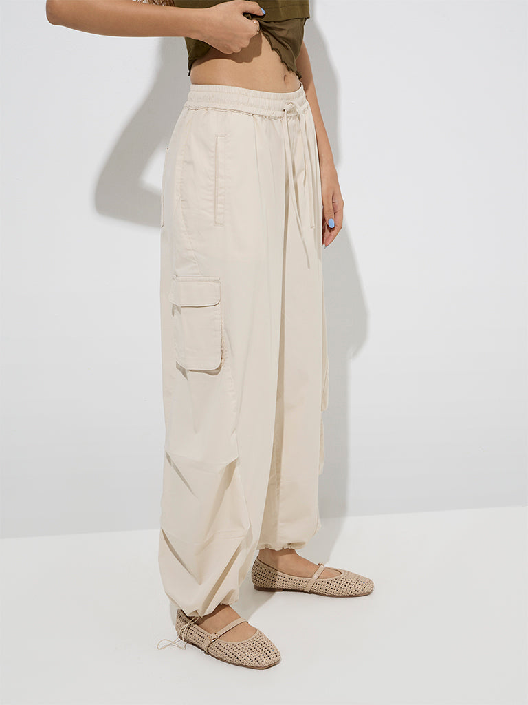 These beige harem-style pants from Nuon are designed for laid-back ease with their relaxed silhouette and soft cotton-blend composition. The elasticated waistband with adjustable drawstrings ensures a custom fit. while multiple functional pockets add a utilitarian touch.