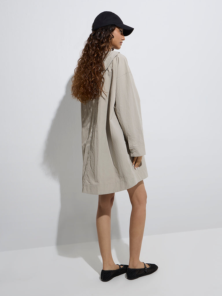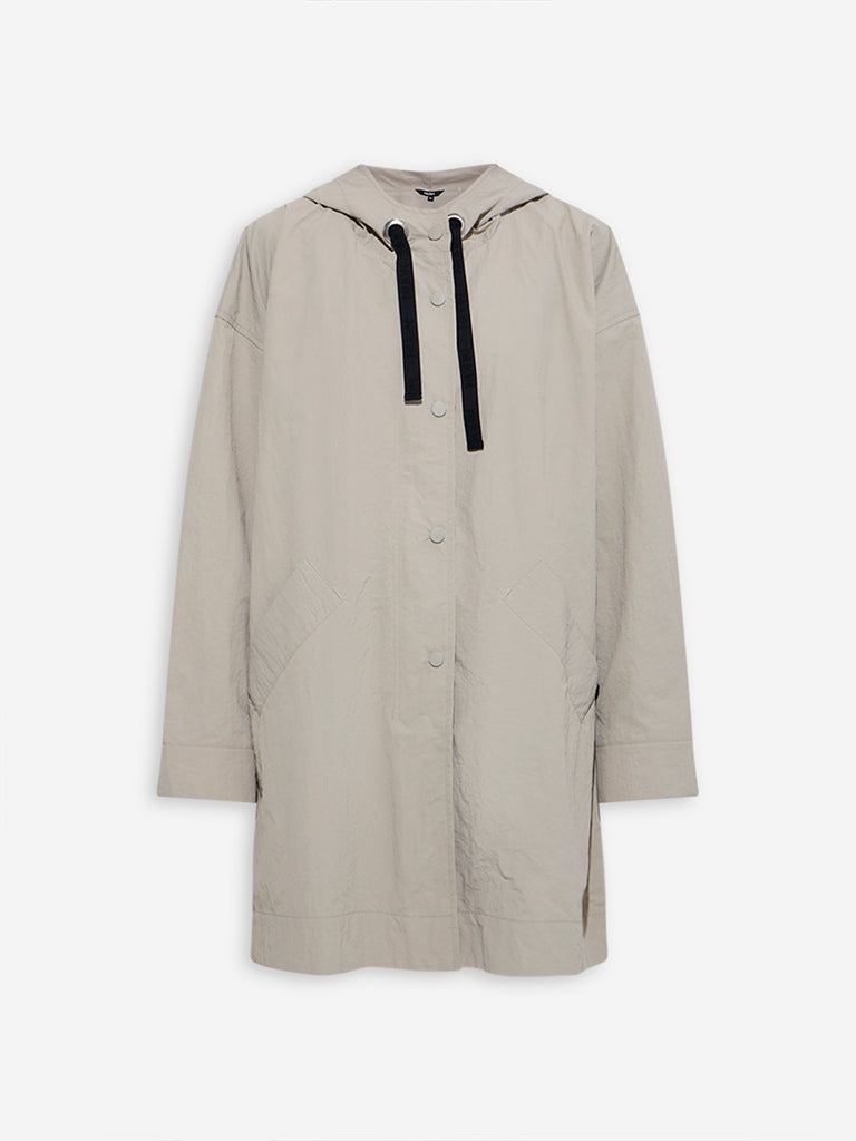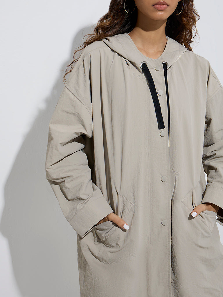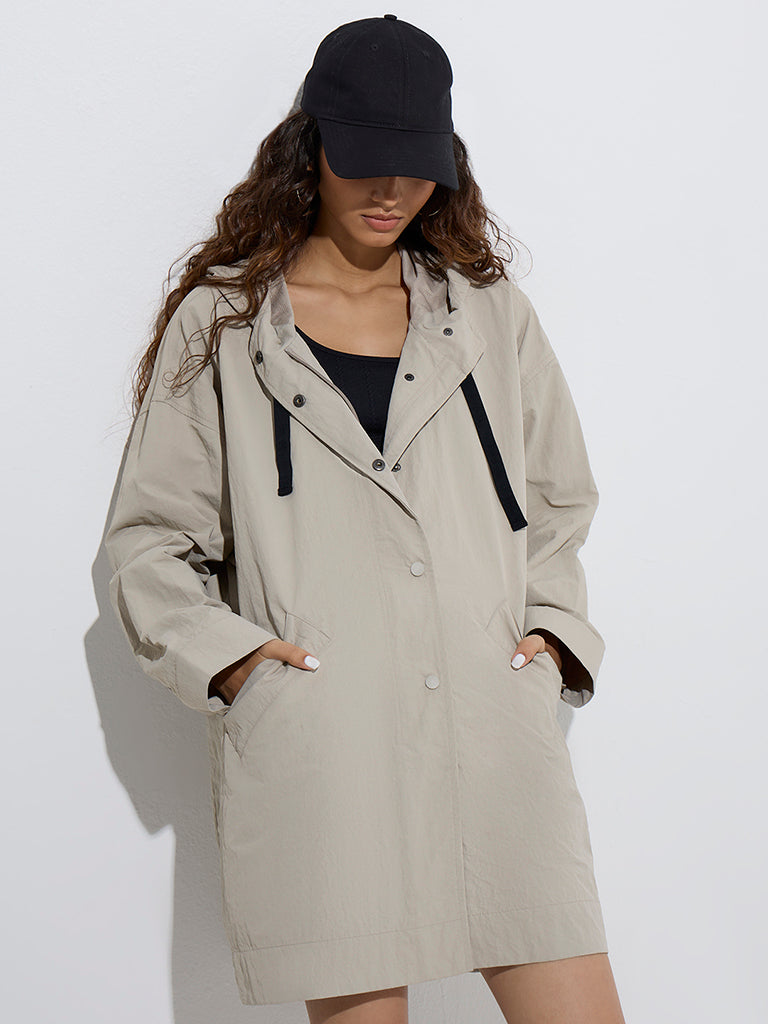 Nuon introduces this beige jacket. a functional layering essential for versatile style and comfort. Designed with a hood for added warmth. it features a snap button placket. full sleeves. and welt pockets for added practicality.