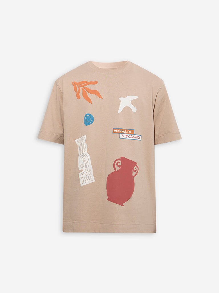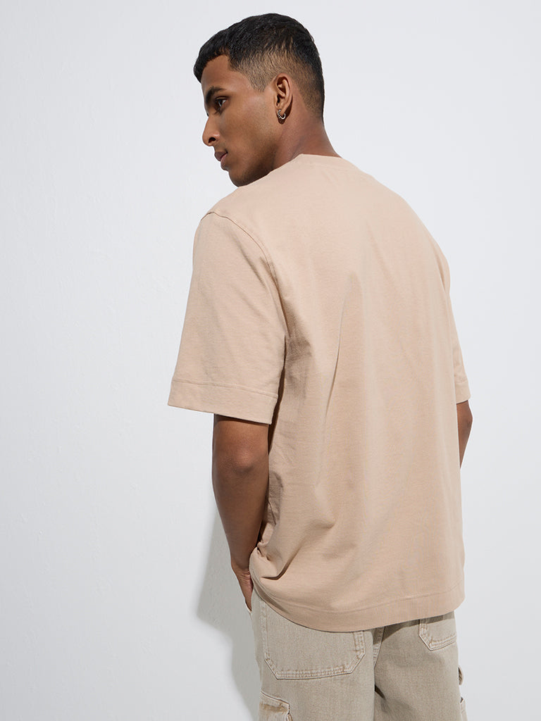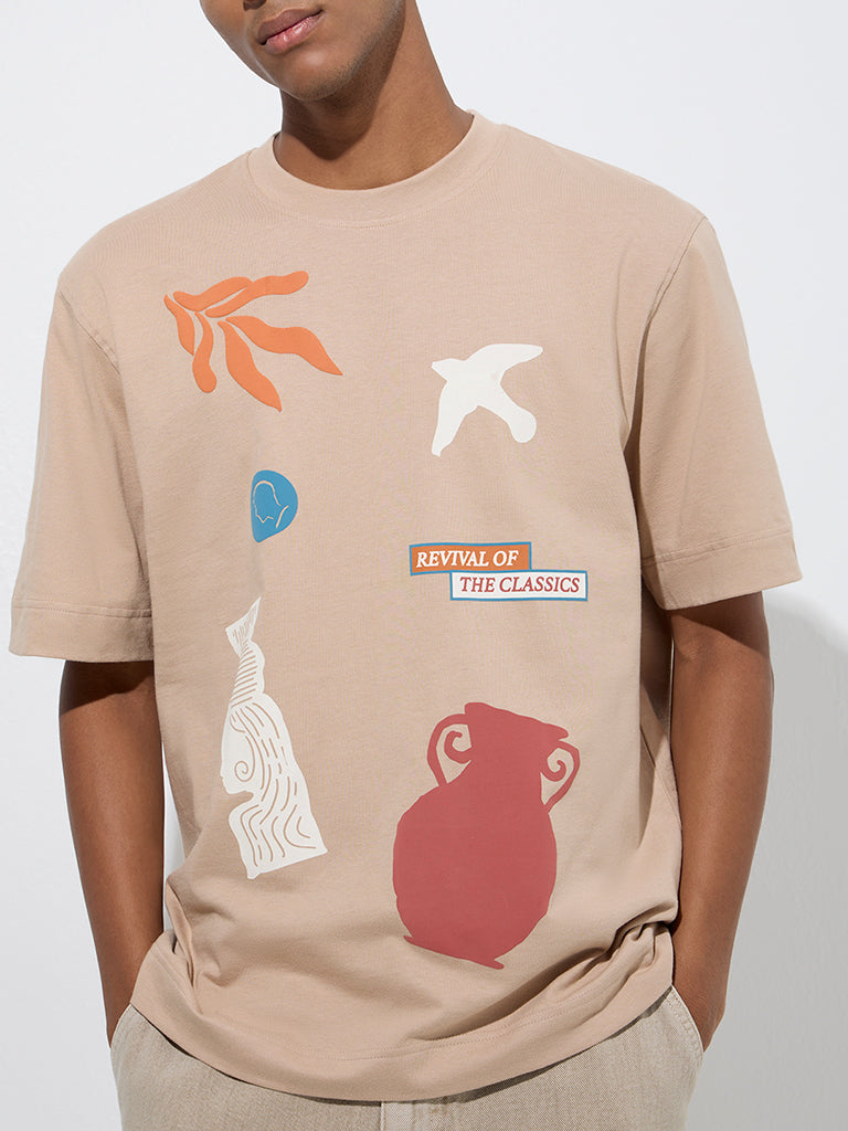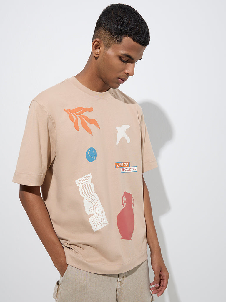 Nuon Beige Printed Relaxed-Fit Cotton T-Shirt