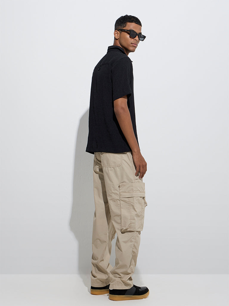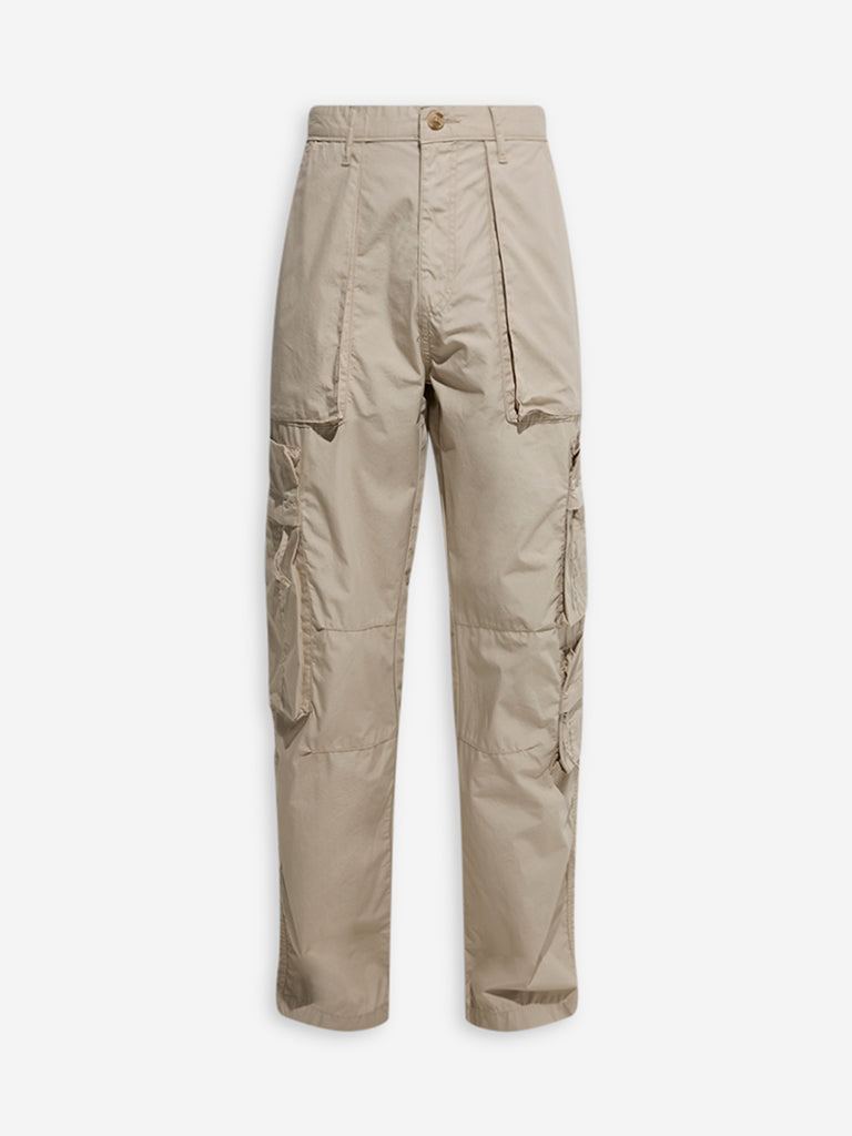These beige chinos from Nuon are fashioned in a cargo profile for a utilitarian edge. Crafted from a cotton-rich fabric for enhanced comfort. this relaxed-fit pair is detailed with a buttoned closure. zipper placket. belt loops. and multiple pockets for added utility.