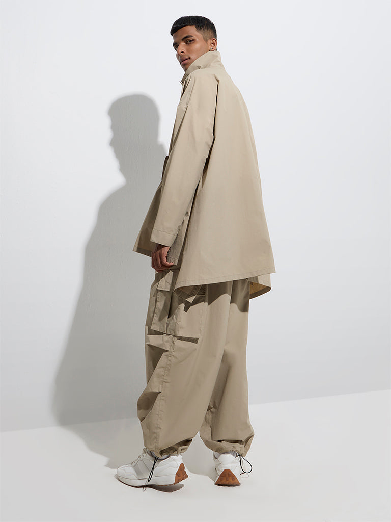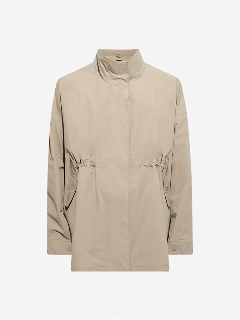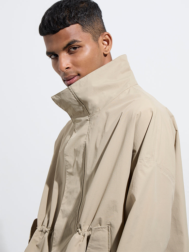 Nuon launches this beige parka jacket. a functional layer ideal for transitional weather and easy layering. Milled from a breathable fabric in a relaxed silhouette. it’s styled with a high neck collar that extends into a snap-button placket and drop shoulders for laid-back ease. Finished with kangaroo pockets. it brings a utilitarian edge to everyday dressing.