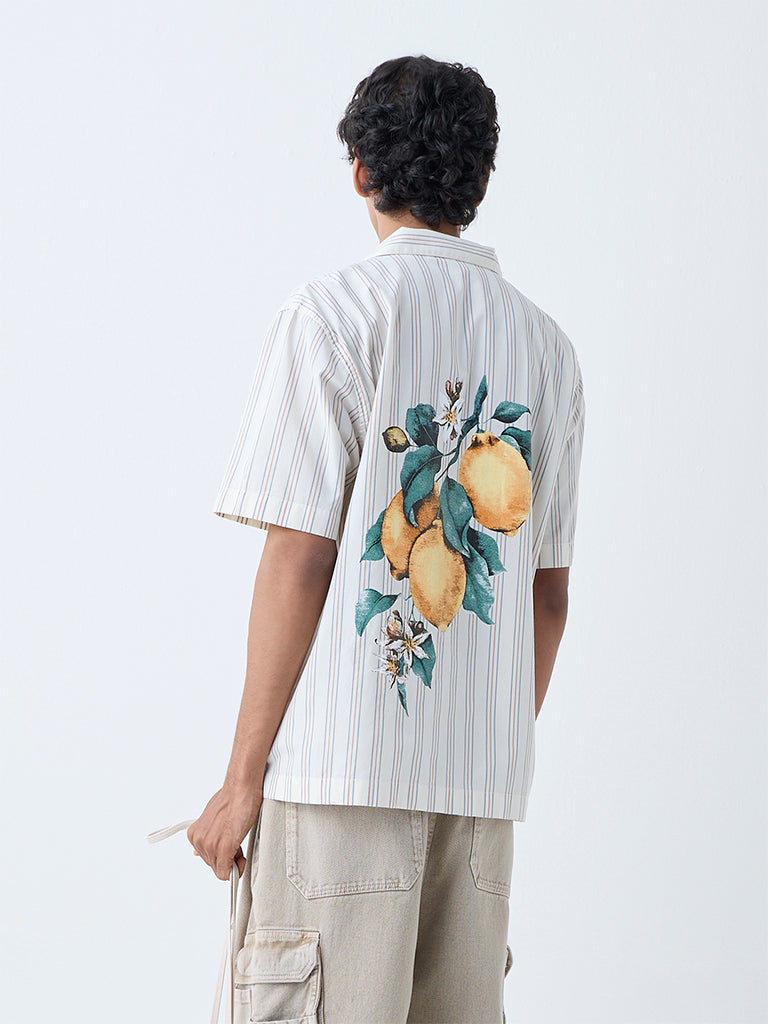 Add personality to your summer layers with this beige shirt from Nuon. Crafted from pure cotton in a relaxed frame. it highlights timeless stripes and a bold foliage print at the back for unexpected detail. Finished with a camp collar. short sleeves. and a button placket. it’s made for days that call for style without effort.