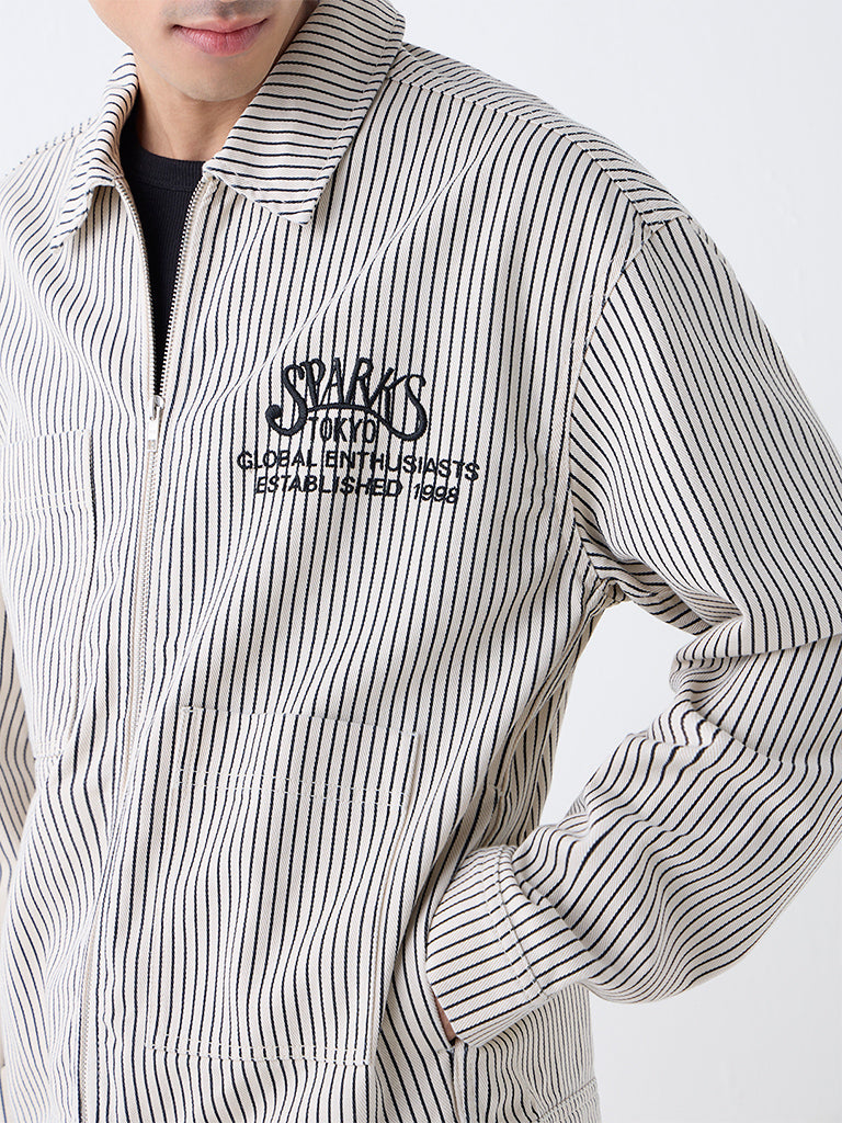 Crafted from breathable cotton. this relaxed jacket by Nuon features tonal beige stripes and subtle text embroidery for a modern edge. Designed with a spread collar. ziplined front. full sleeves. and multiple pockets. it brings effortless style to everyday looks.