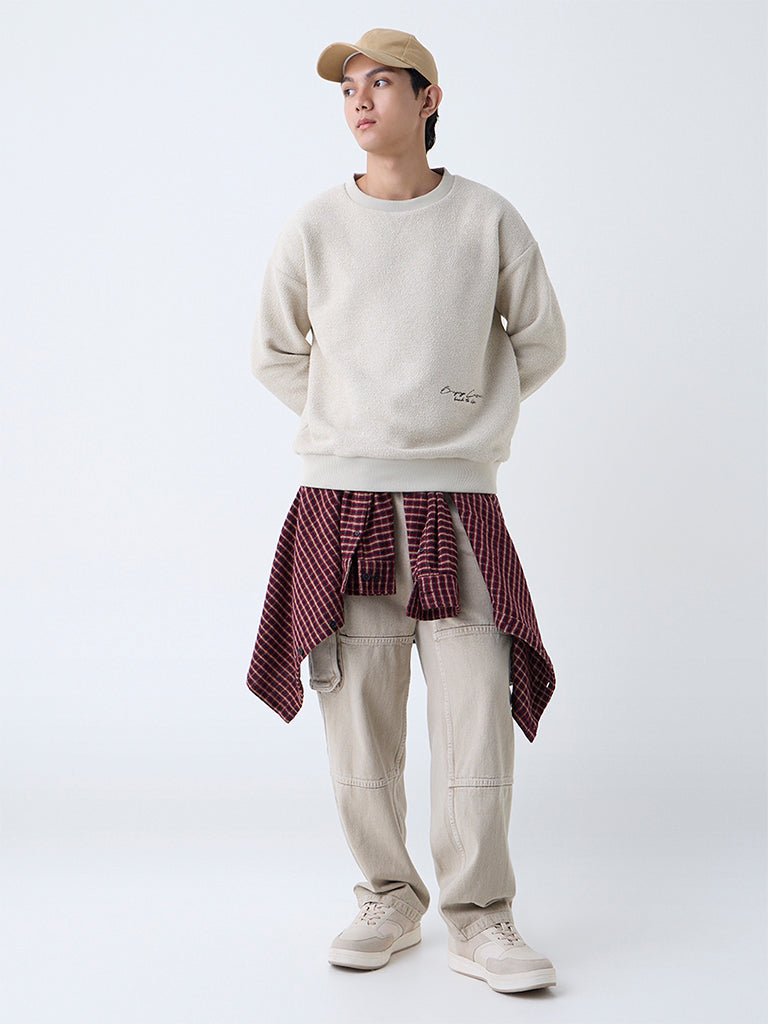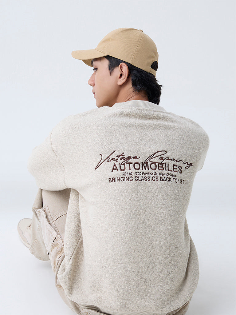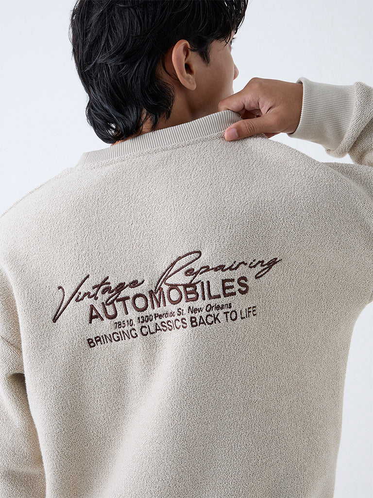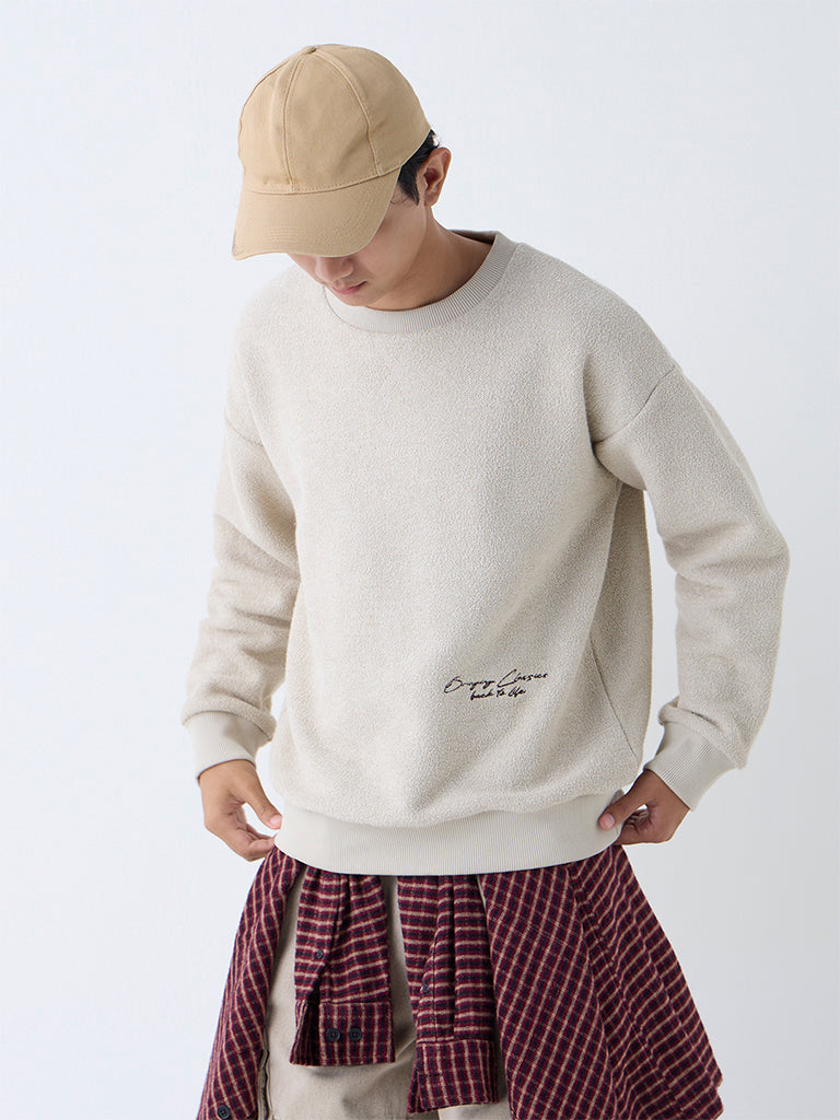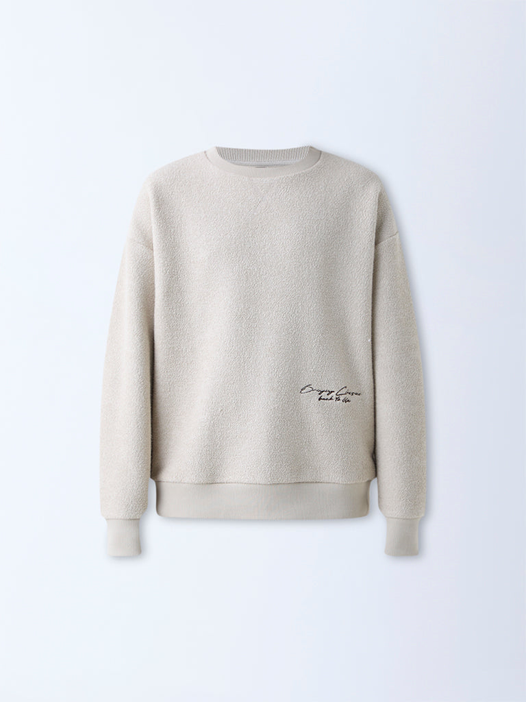 Nuon Beige Text Design Relaxed-Fit Cotton-Blend Sweater