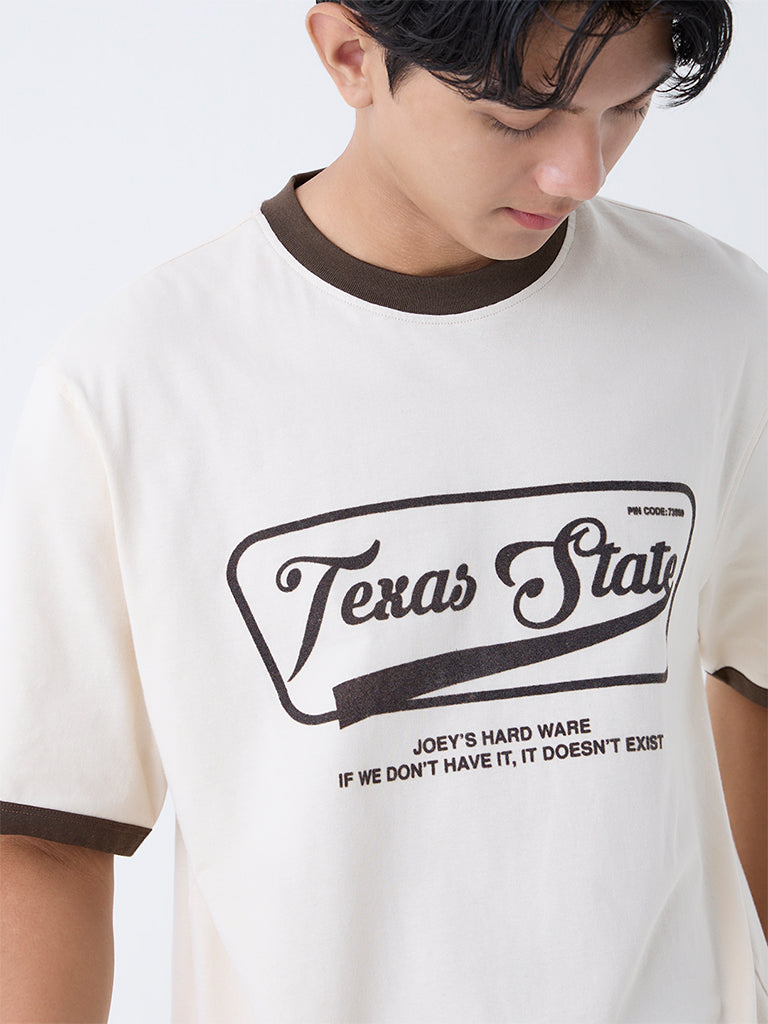 Nuon Beige Text Design Relaxed-Fit Cotton T-Shirt
