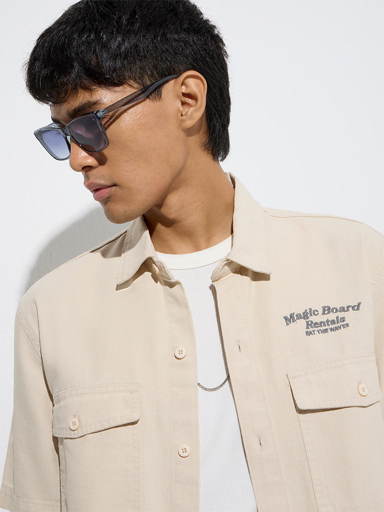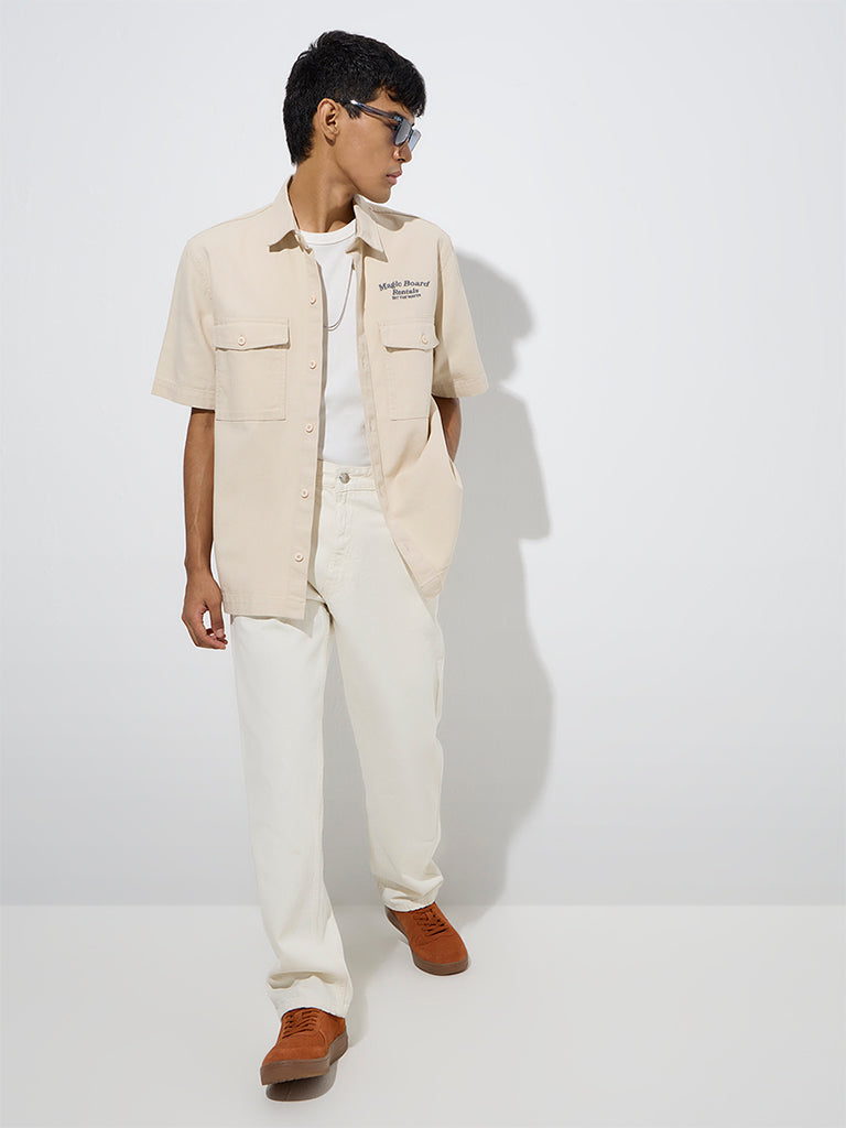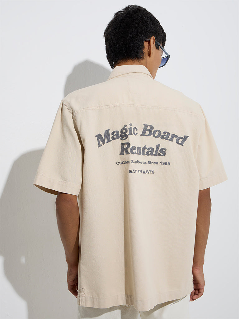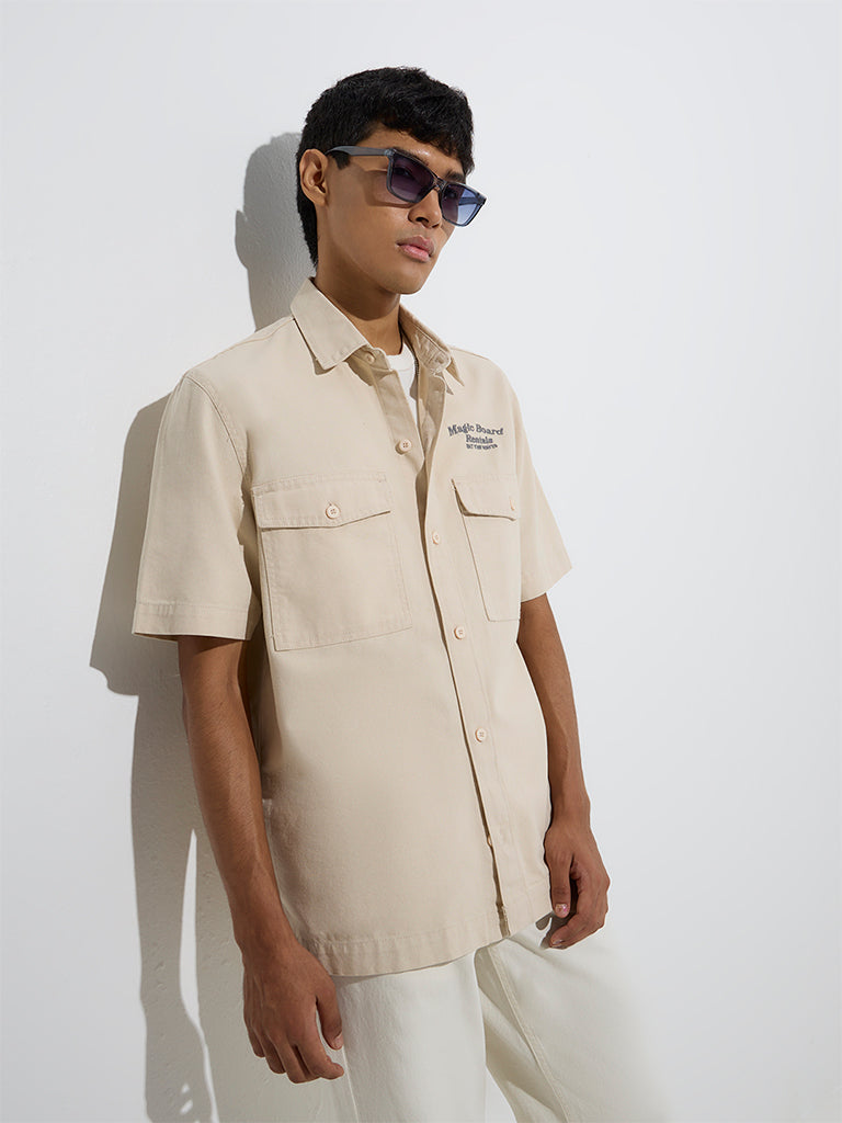 Nuon Beige Typographic Relaxed-Fit Cotton Shirt