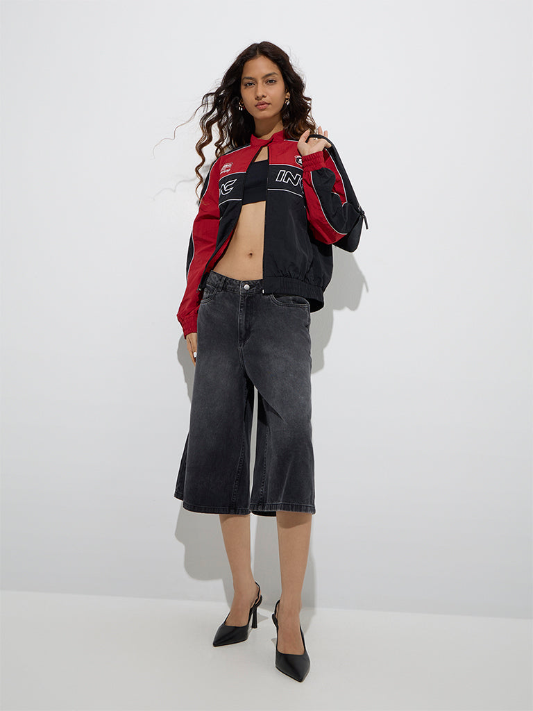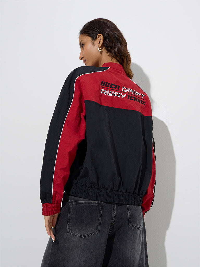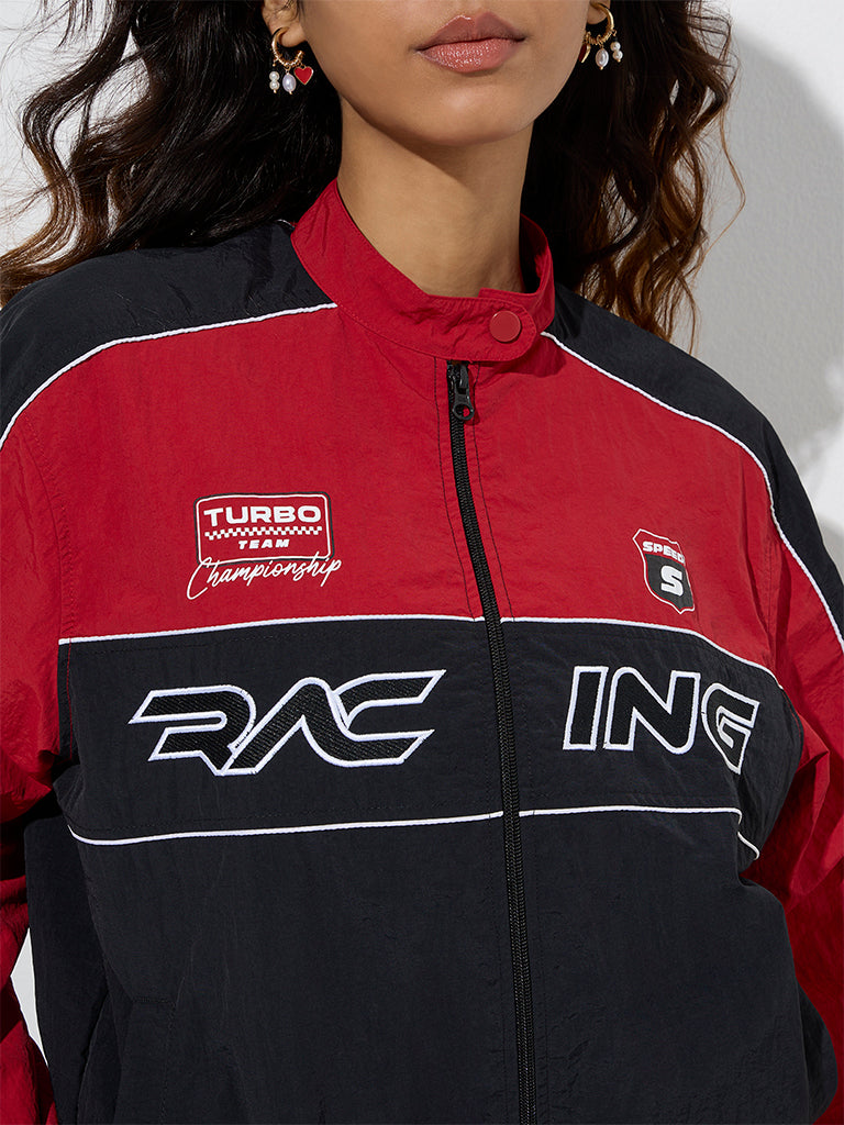 Amp up your streetwear style with this black jacket from Nuon. featuring a bold colour-blocked design and racing-inspired badges that channel retro-sport vibes. Fashioned for impact. it’s styled with a high neck. zipper front. and full sleeves for a structured silhouette. Functional side pockets complete the look. making it a standout pick for both style and utility.