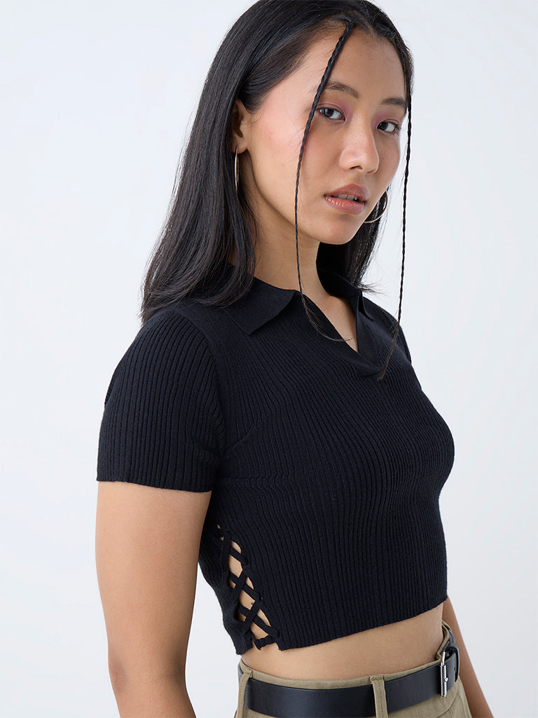 Nuon Black Criss-Cross-Detailed Ribbed T-Shirt