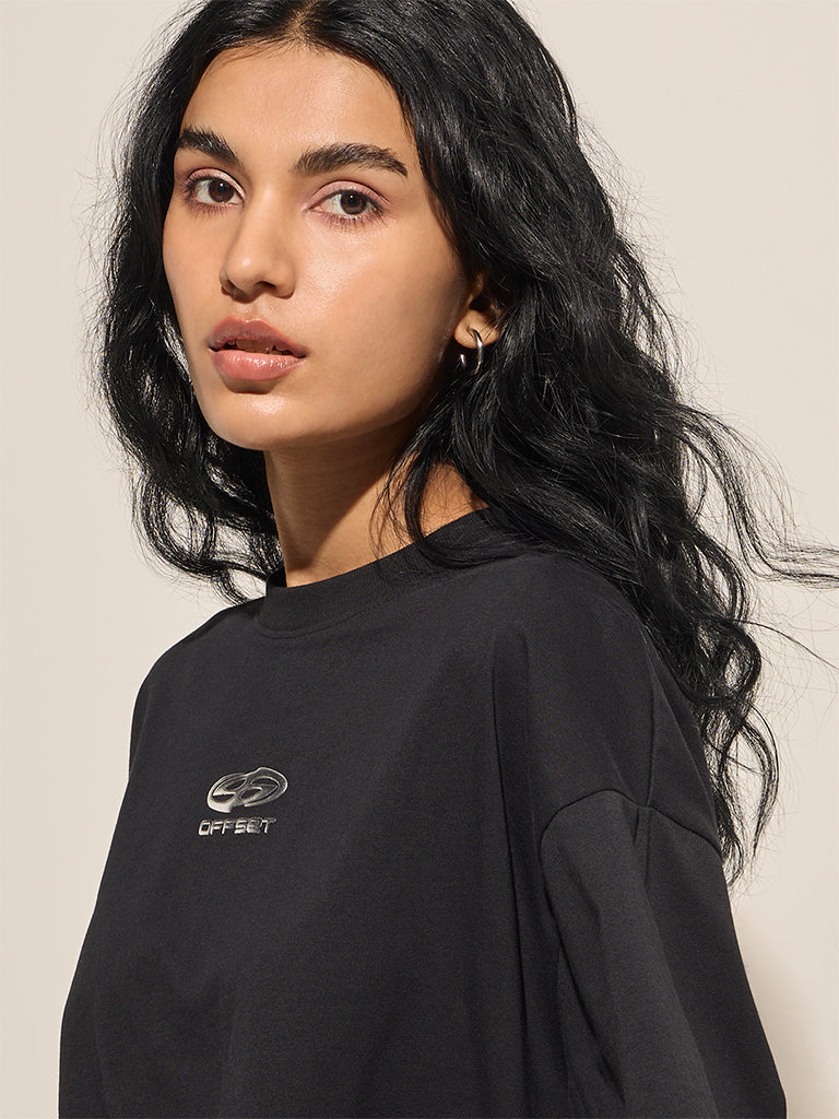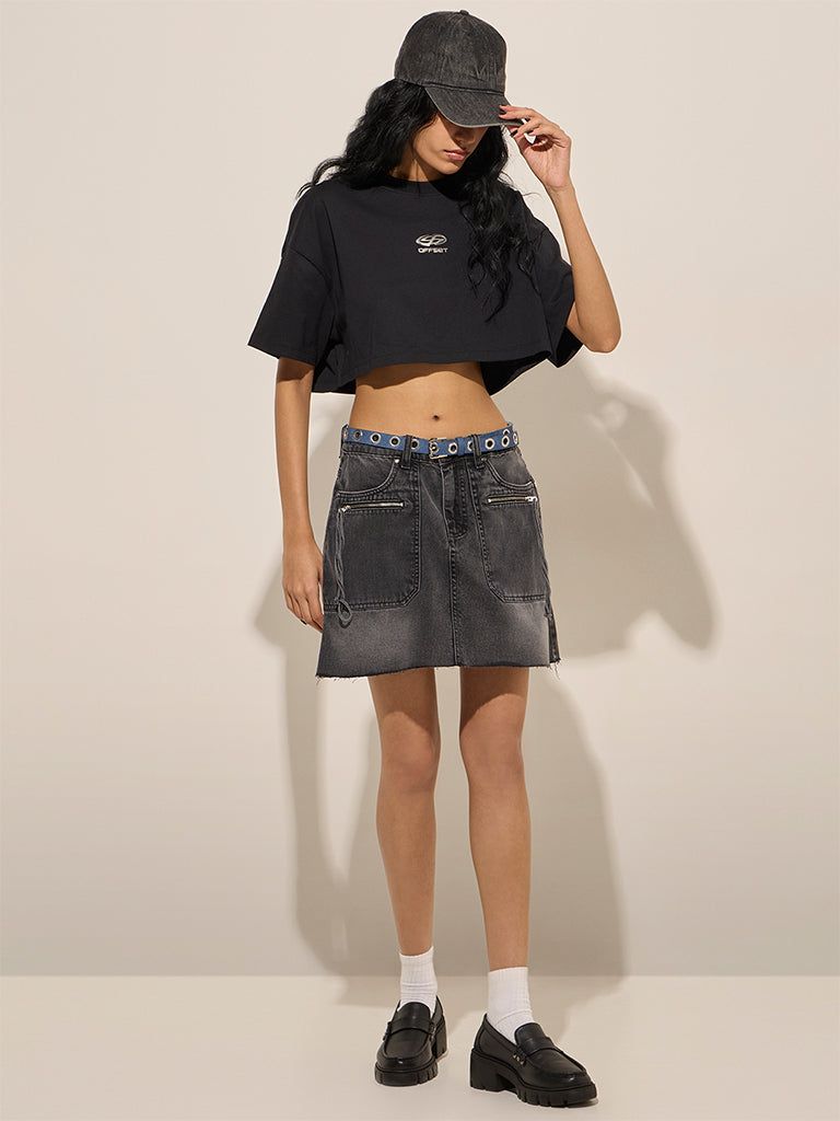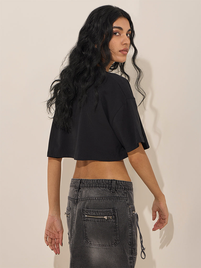 This black crop t-shirt by Nuon is designed with printed detailing. Crafted in a cotton-rich blend. it offers a round neck and half sleeves.