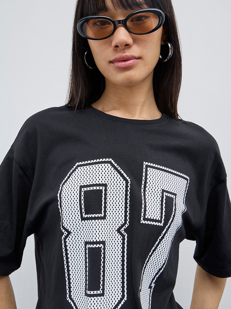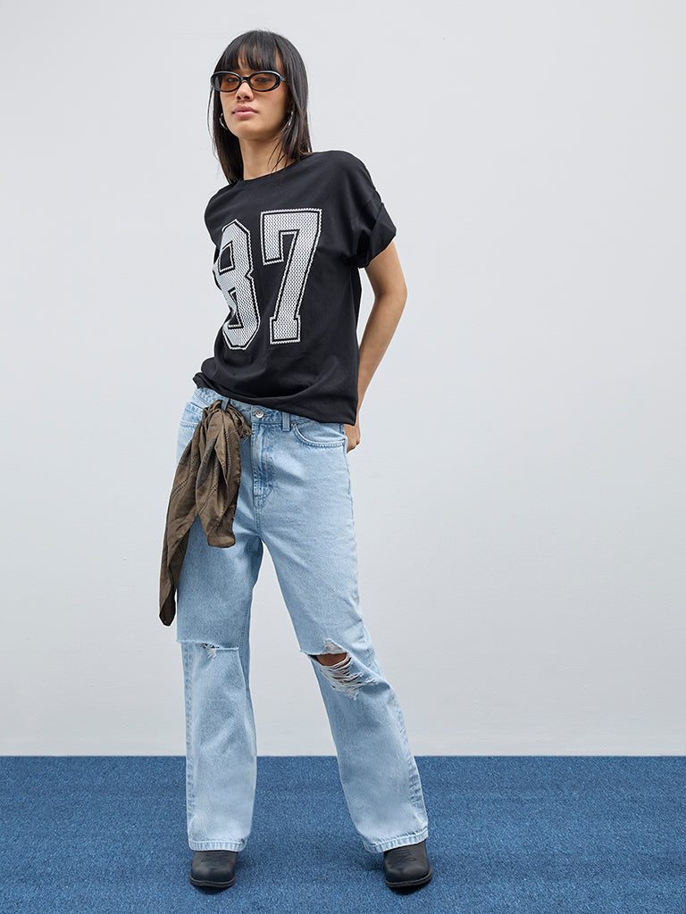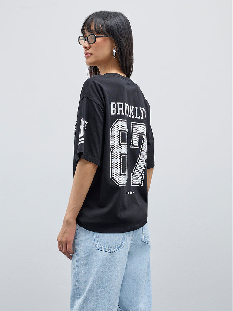 This black t-shirt by Nuon features numerical prints. Built with pure cotton. it includes a round neck and half sleeves.