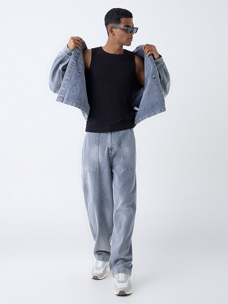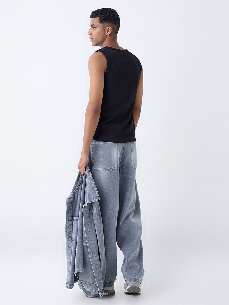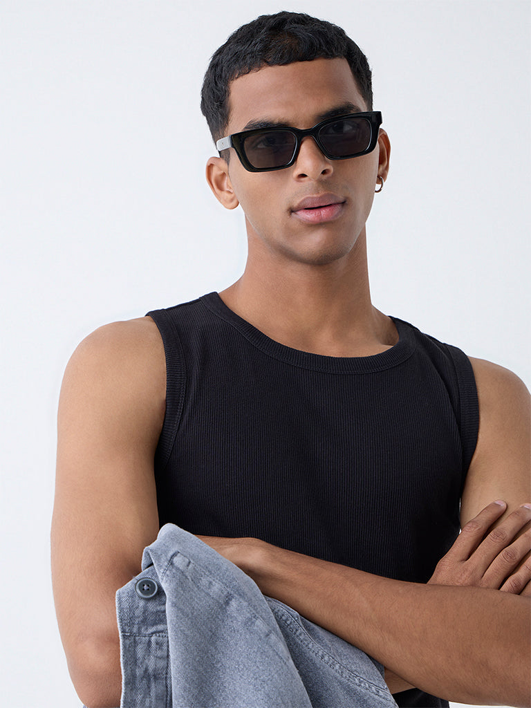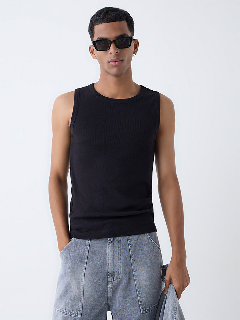 This black t-shirt from Nuon is crafted from a cotton-rich fabric with a ribbed texture. Featuring a slim-fit silhouette. it carries a round neck and a sleeveless profile. an easy-going essential suitable for layering or casual standalone wear.