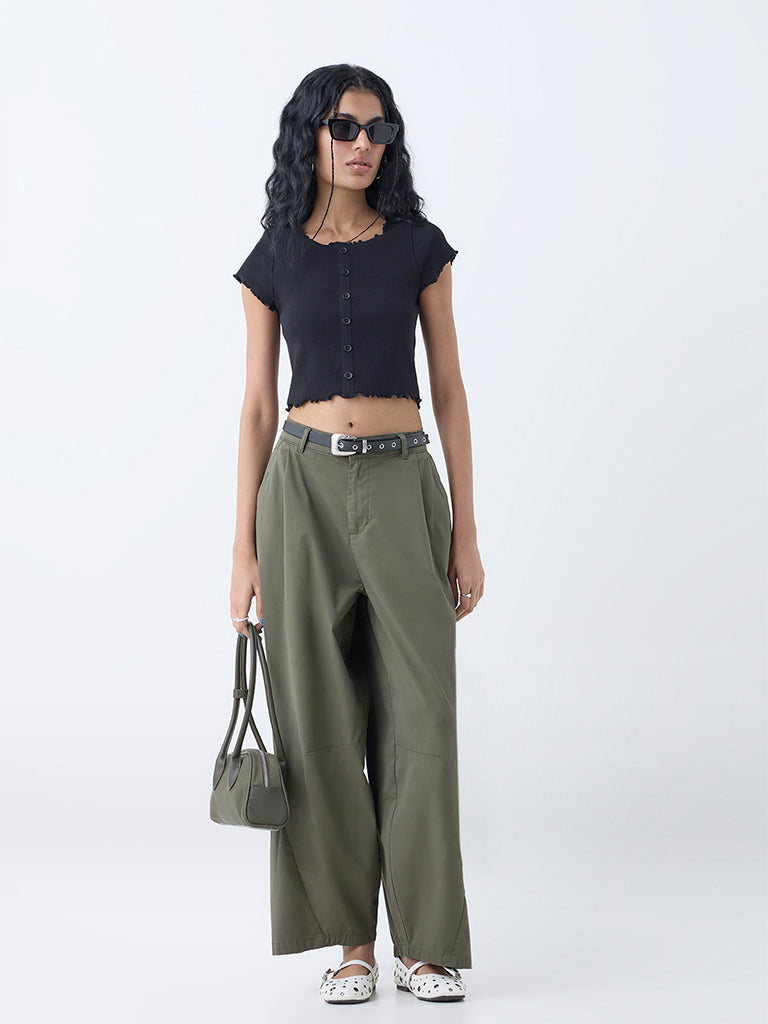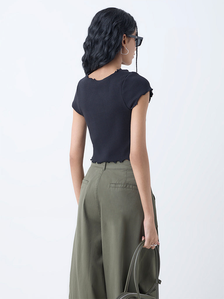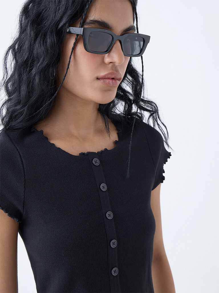 Add subtle charm to your outdoor contingent with this black top from Nuon. Created from a cotton-blend fabric in a ribbed profile. it carries a round neck. short sleeves. and a chic button placket. Fluted trims lend a feminine touch to the minimal silhouette.