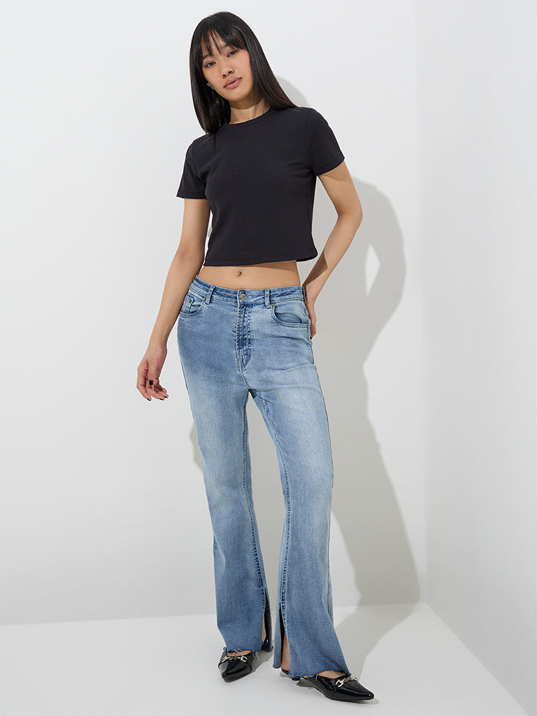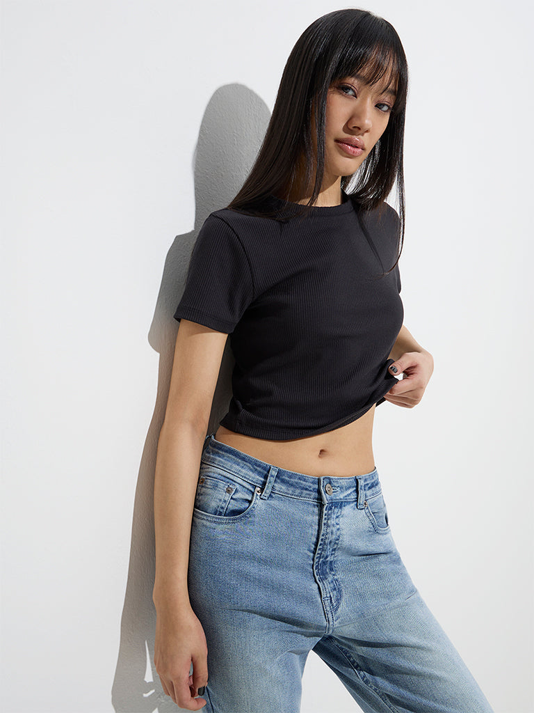 This black t-shirt from Nuon is crafted from a lightweight fabric with a ribbed texture for added depth. A wardrobe essential. it features a classic crew neck and half sleeves. offering a comfortable and versatile fit.