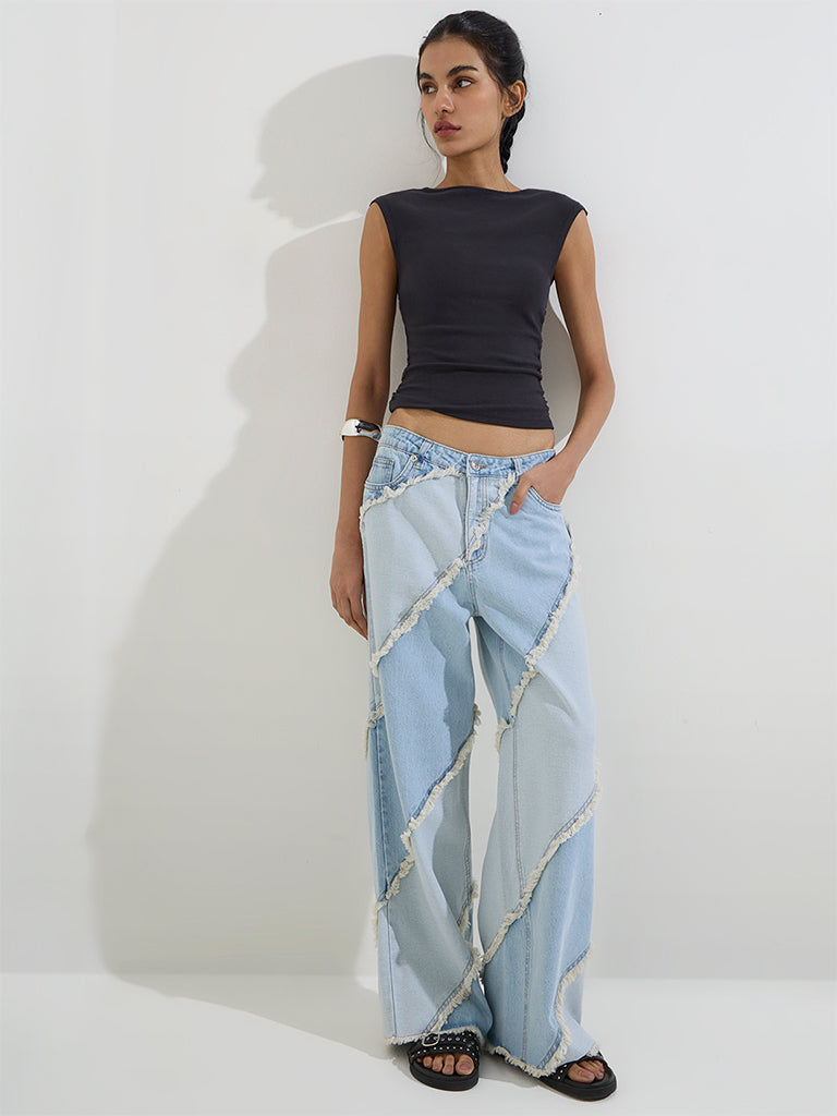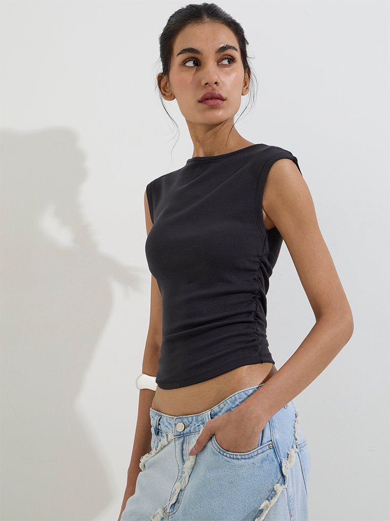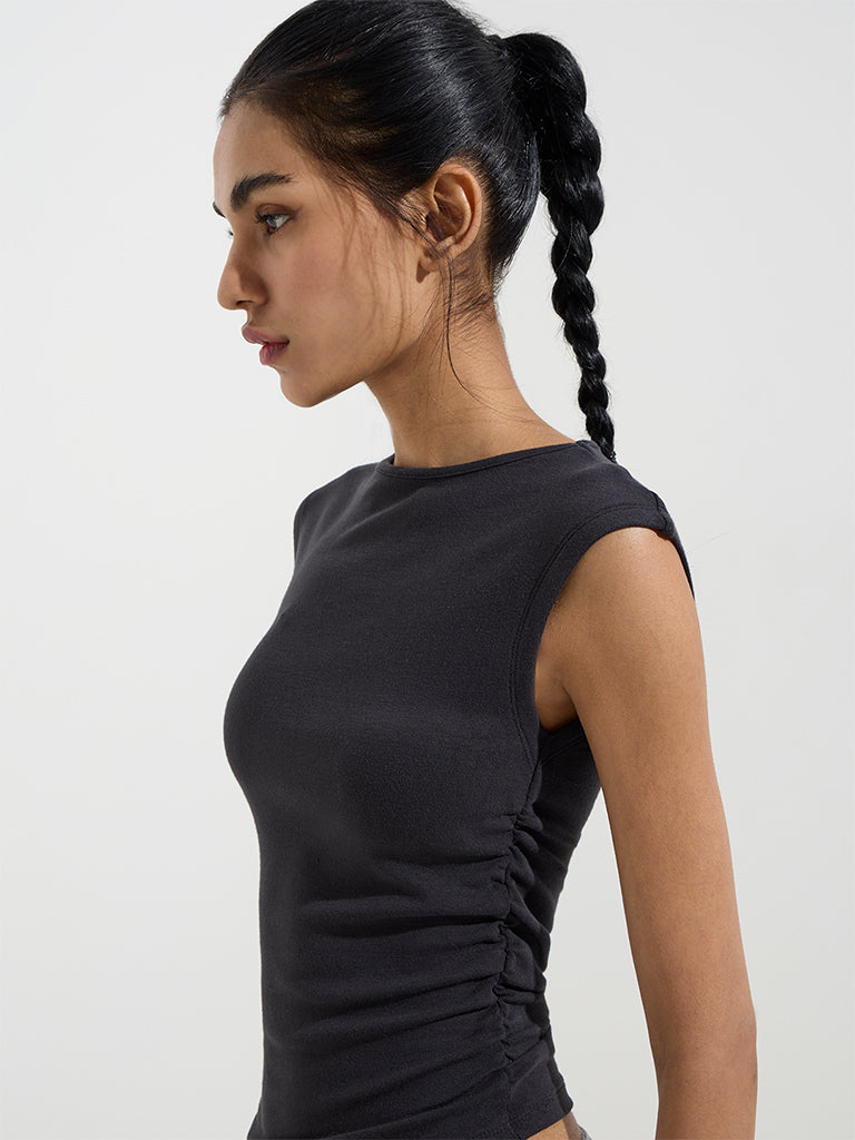 This black t-shirt from Nuon is designed a round neck. cap sleeves. and ruched details on the sides. Crafted from lightweight fabric. it serves as an effortless choice for warm-weather outings.