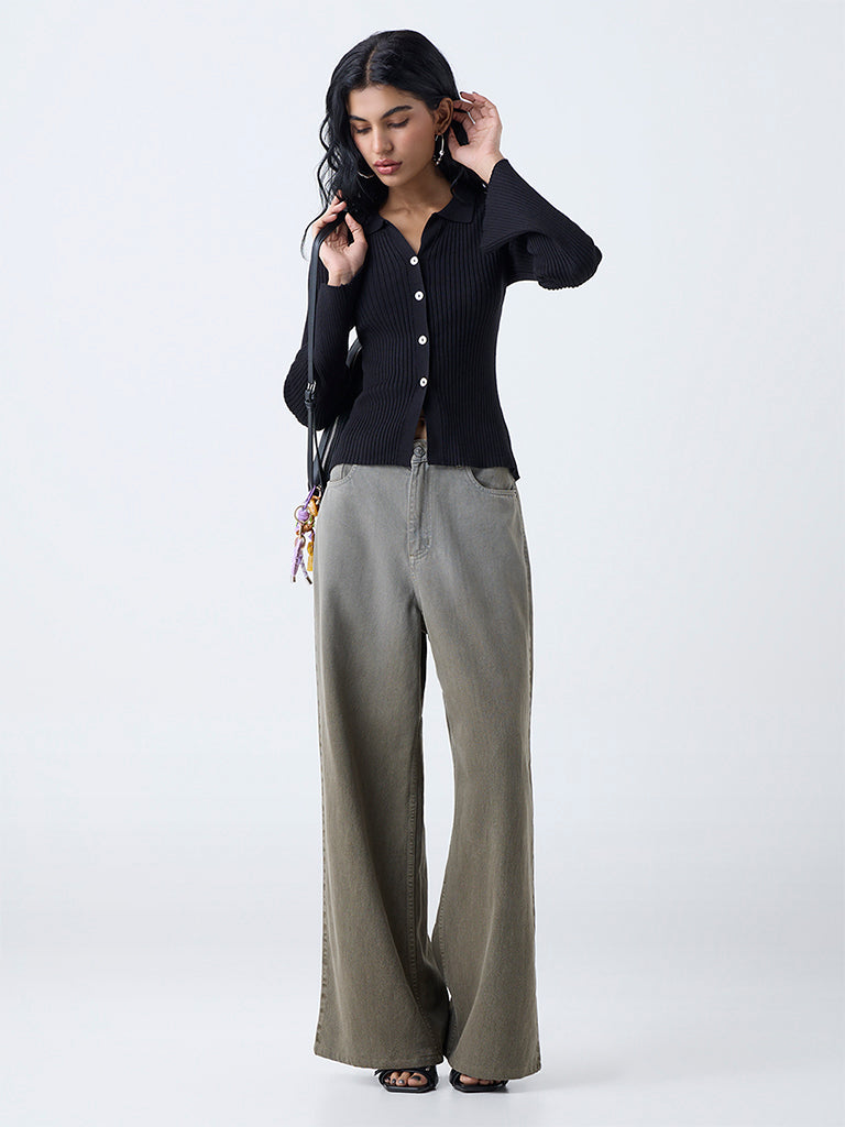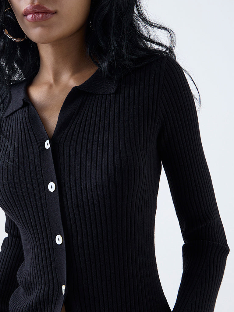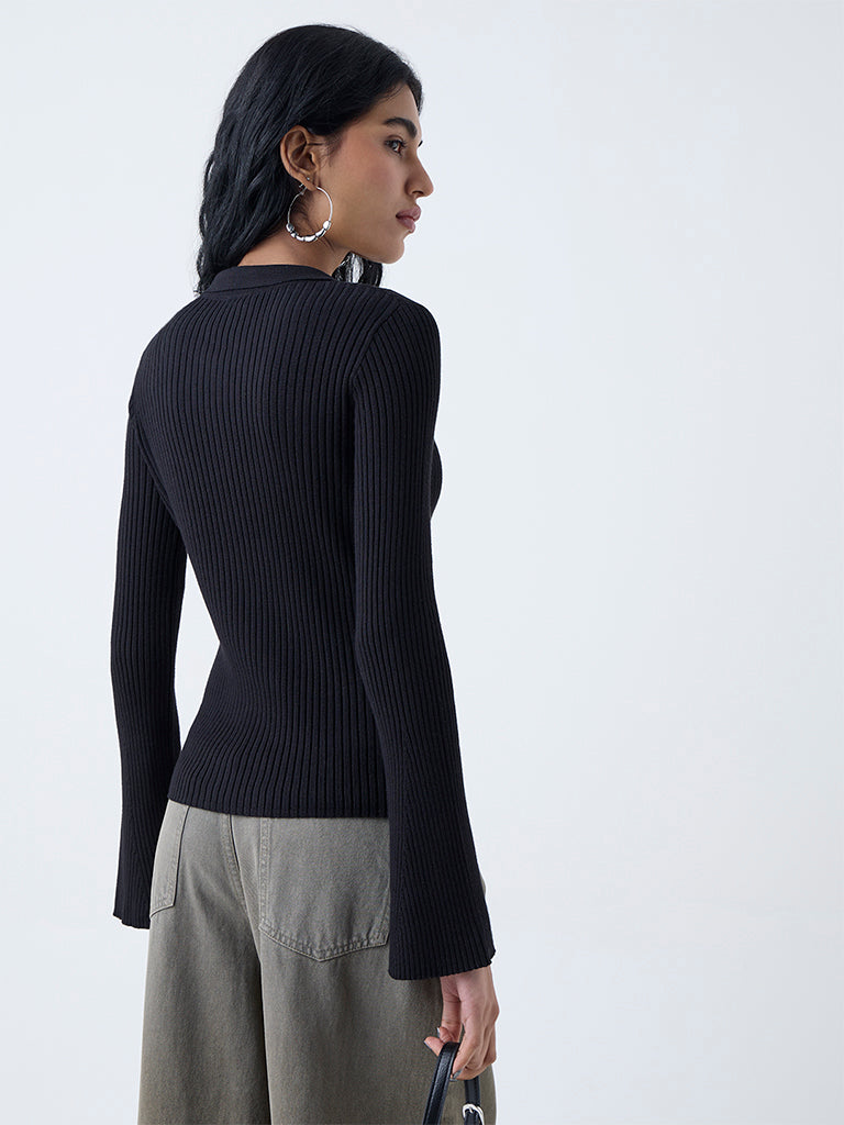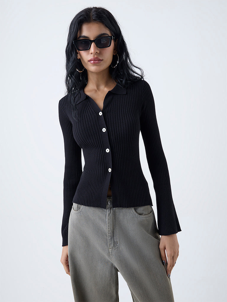 Nuon launches this black top showcasing a tactile self-stripe patterns on a soft. breathable fabric build. Designed with a collared. a button-up front and bell sleeves. it combines structure with fluidity. The streamlined finish gives it a contemporary character. making it a standout everyday piece.