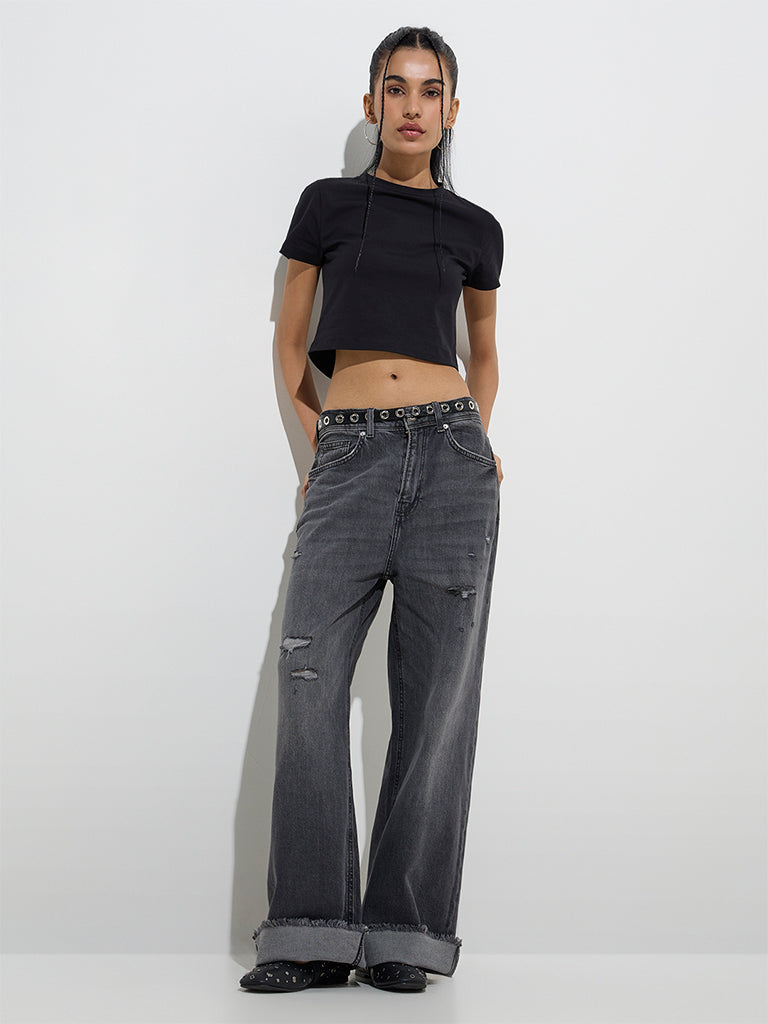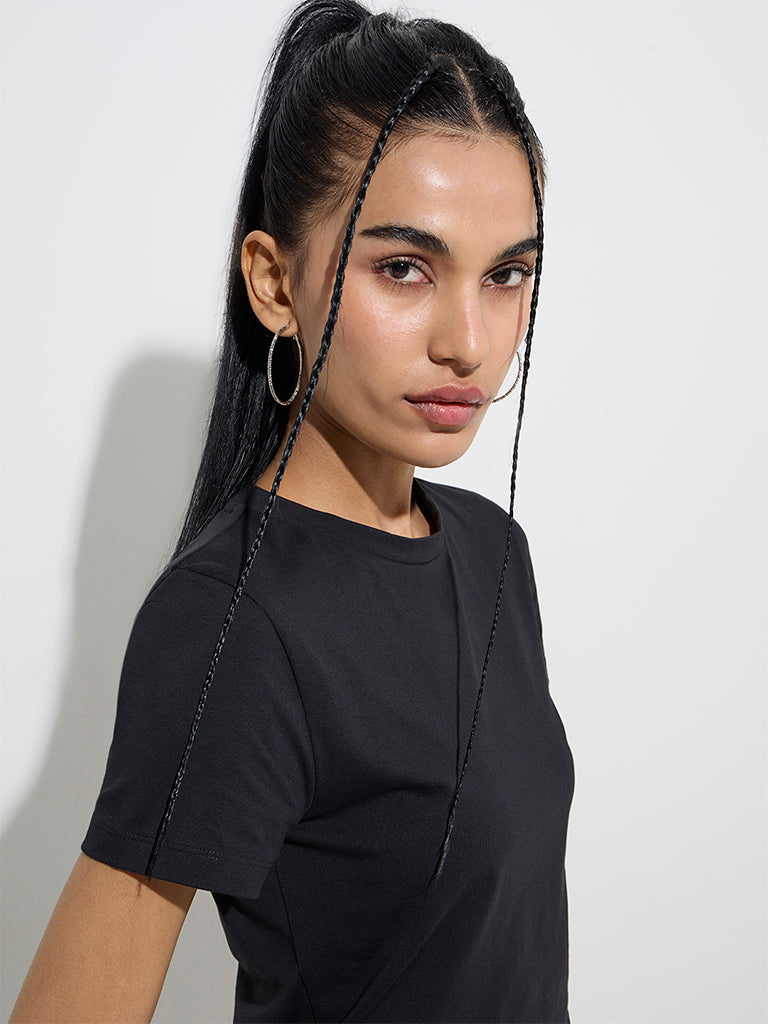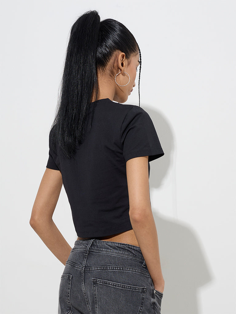 This black t-shirt from Nuon combines classic style with a modern twist. Featuring short sleeves and a round neck. it’s made from a cotton-blend fabric in a trendy cropped silhouette for a bold. fashion-forward look.