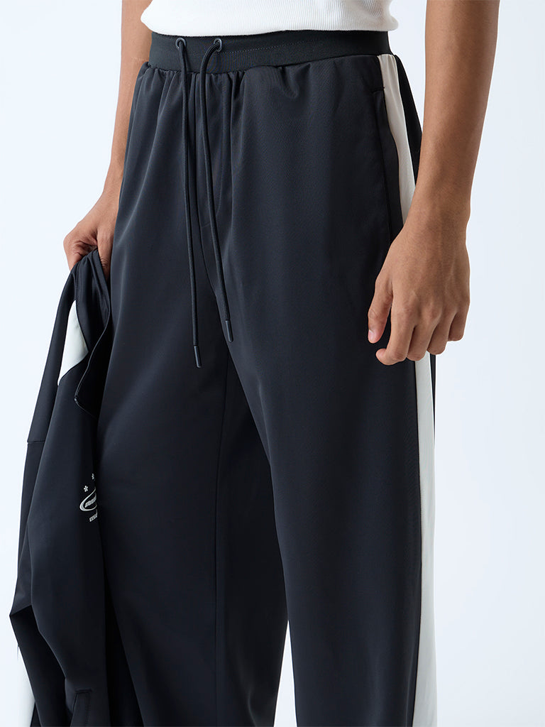 Breeze through your day in effortless style with these black pants from Nuon. accented with contrast stripes on the sides for a sporty edge. Made from a lightweight fabric in a relaxed silhouette. they offer ease of movement and all-day comfort. The elasticated waistband with adjustable drawstrings ensures a secure fit. making them perfect for weekend hangouts.