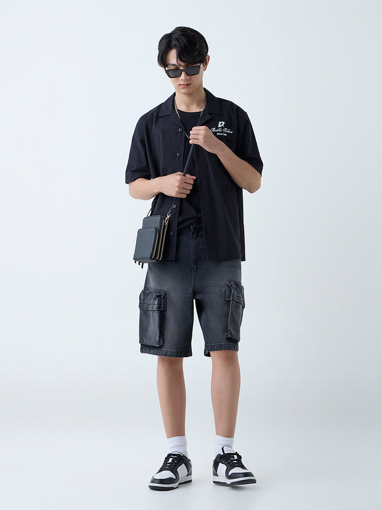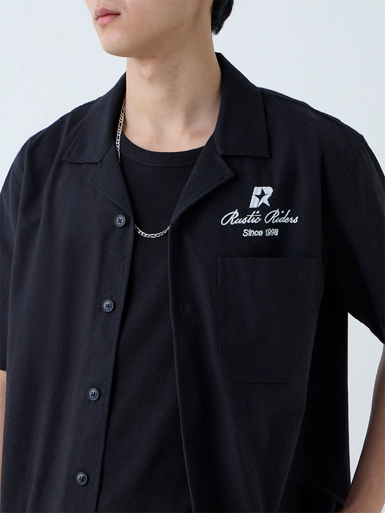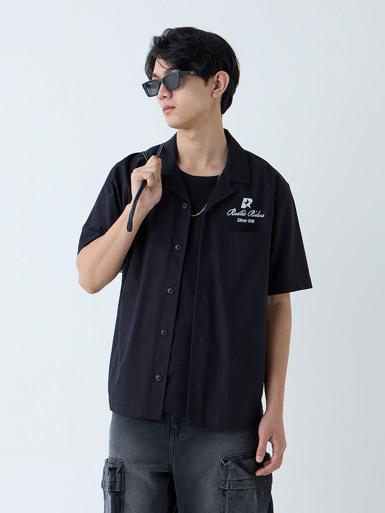 This black shirt from Nuon brings a cool. pared-back attitude to casual wardrobes. Made from a cotton-rich fabric in a relaxed frame. it features a camp collar. half sleeves. a button placket. and a chest pocket. A touch of text embroidery at the front adds subtle character without overpowering the look.