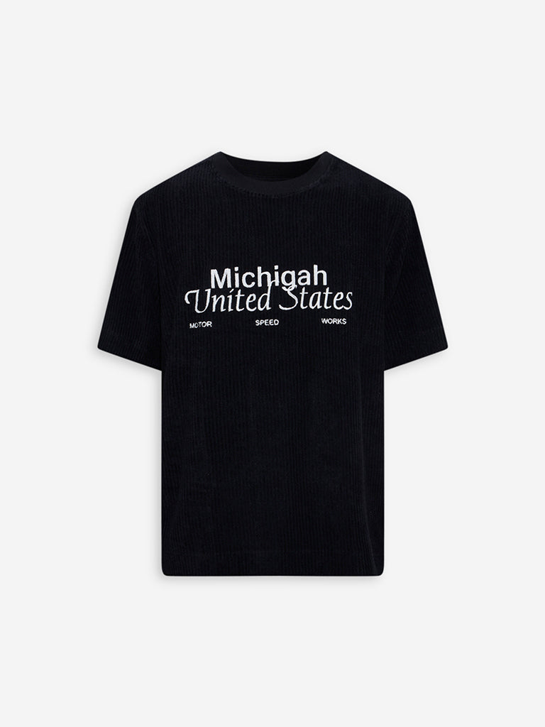 Nuon launches this black tee that taps into streetwear attitude with bold text prints stamped across the front. Woven from a cotton-blend fabric in a ribbed profile. this relaxed-fit piece is styled with a classic crew neck and half sleeves.