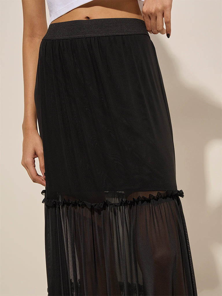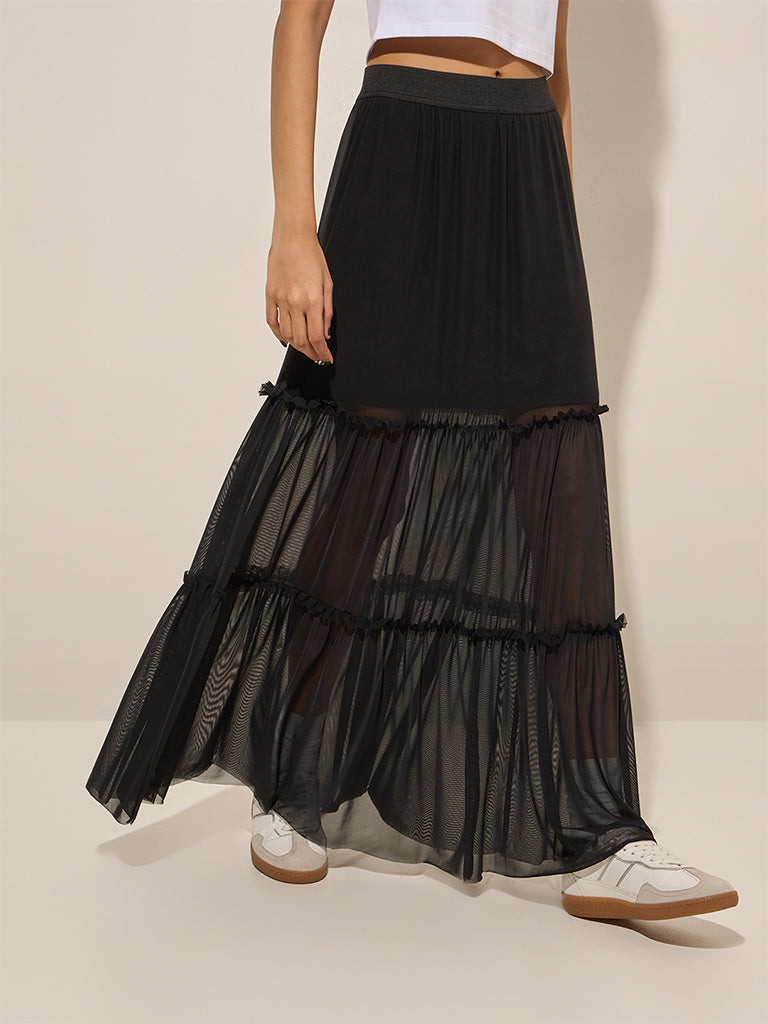 Nuon presents this black skirt featuring a tiered silhouette with flouncy layers and captivating ruffled detailing for a bold statement. Crafted from sheen mesh fabric. it offers a dreamy and elegant appeal. The smooth elastic waistband ensures a secured fit.