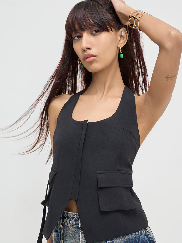 Nuon introduces this black waistcoat-style top in your casual edit. Milled from a lightweight fabric. it is designed with a halter-neck and flap pockets at the front. The backless feature accentuates its appeal.