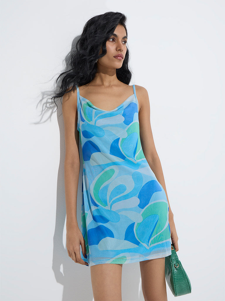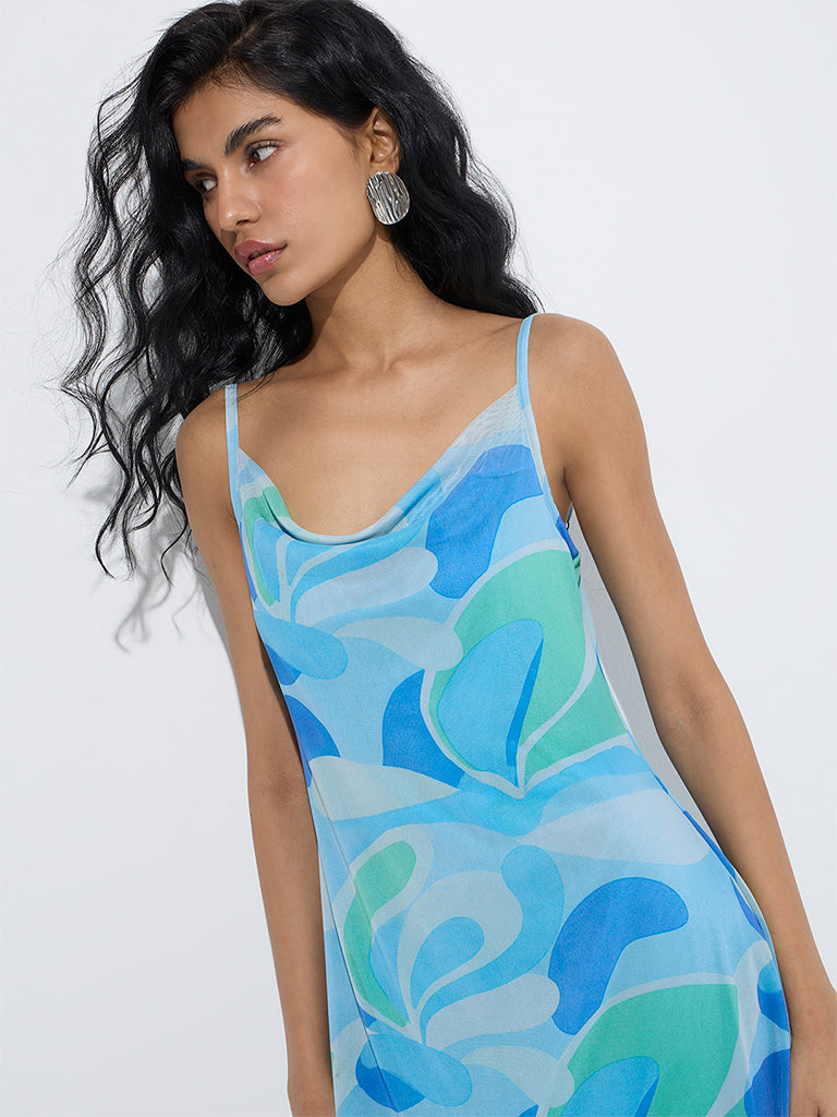 This blue dress by Nuon features bold abstract patterns on an A-line silhouette. Framed with a flattering cowl-neck and adjustable straps. this lightweight fabric garment is an eye-catching selection for summer brunches and elevated evenings.